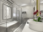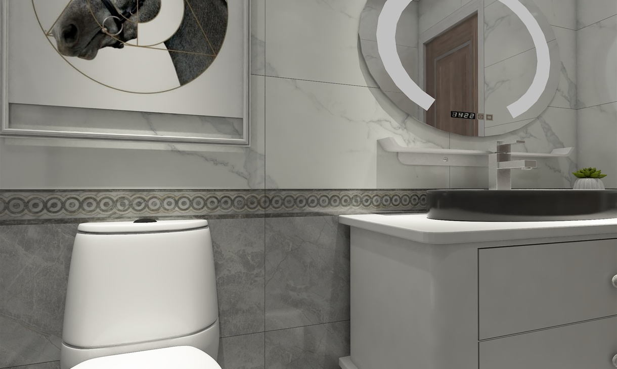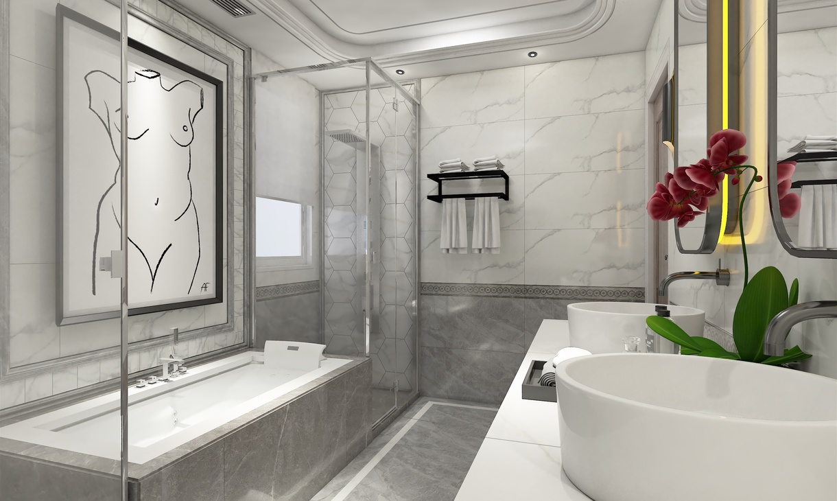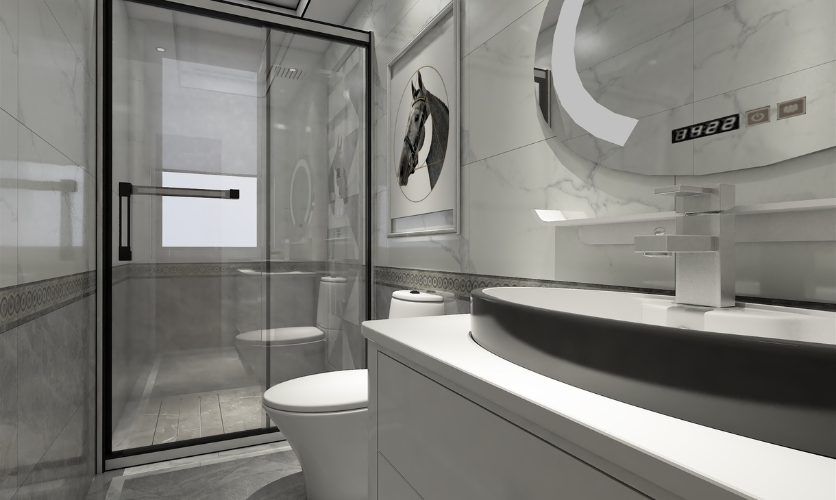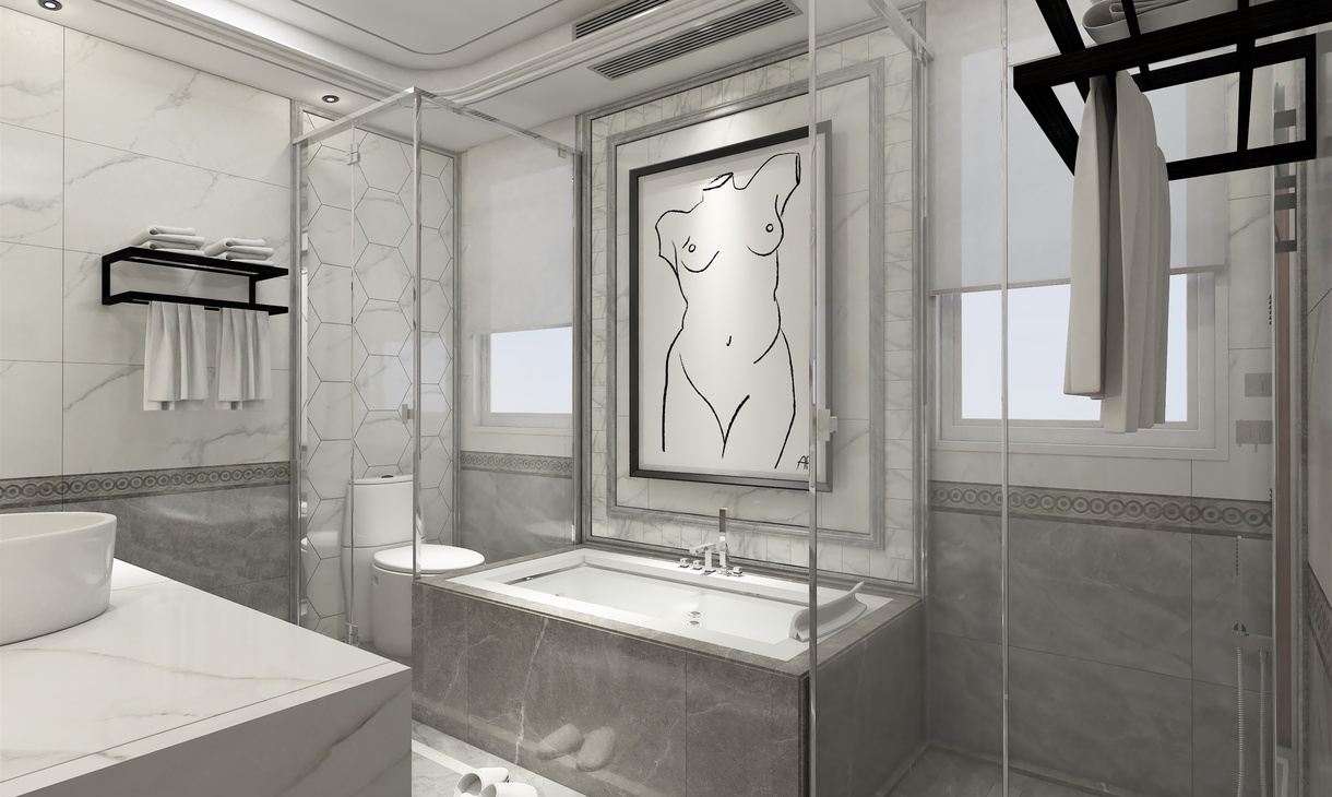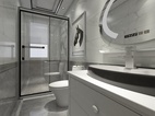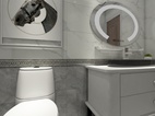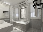 功能布置合理,整体大气,黑白灰瓷砖上墙下地。浴缸背景装饰画点缀整个空间。