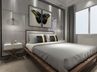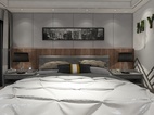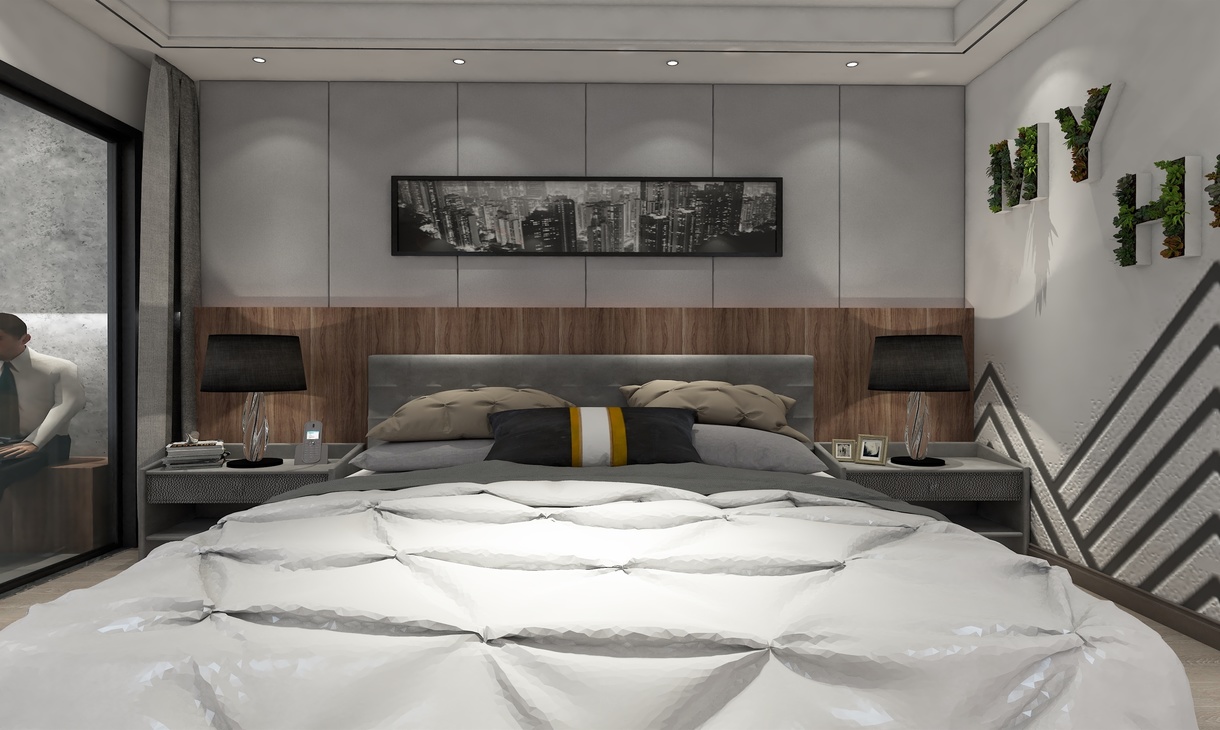 地面通铺浅色耐磨地板,采用拓彩岩铺贴出床头背景,白色搭配黑色的空间,打造低欲却丰富的视觉表现