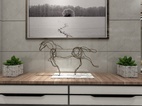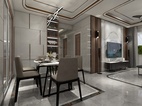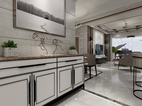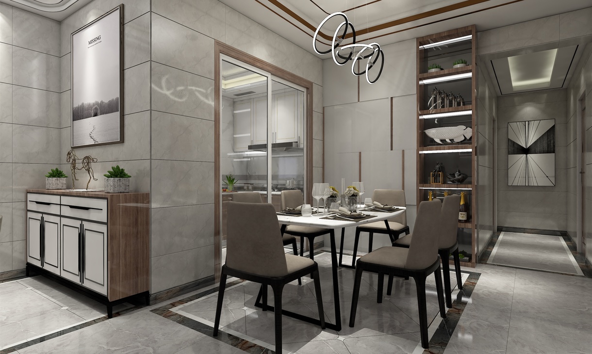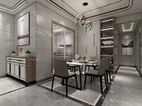 餐厅装修手法延续了客厅的手法,每一处都充满着简约时尚的气息。一侧墙面设计了一整排简洁干脆的墙柜,充分将收纳功能做到最大。对墙面用规格相同的木框挂画来装点缀饰,很好的避免了白色墙面的单调感,左右墙面整体上看很是丰富、自然,且符合现代简约风格的装饰特点。
