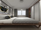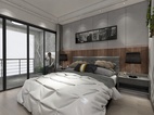 主卧地面通铺浅色耐磨地板,采用拓彩岩铺贴出床头背景,白色搭配黑色的空间,打造低欲却丰富的视觉表现。