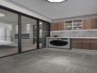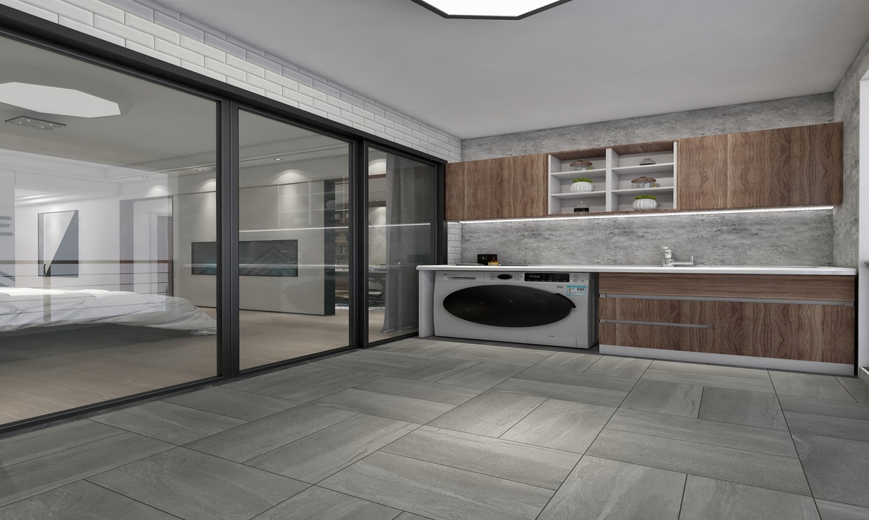 木色造型洗衣机柜,搭配深灰色地砖墙身水泥墙,色调突出,效果明显。
