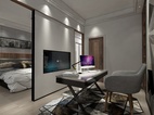 木色修饰电视背景墙,白色对纹大理石点缀。再选择一款灰色柔软的沙发能很好的突出设计,简洁的沙发造型,给人一种很舒适的享受,白色垂地的长帘让空间看起来更加大气,后期桌子上面摆放些绿色的植物,让这个黑白灰色的空间萌生了生机的氛围。