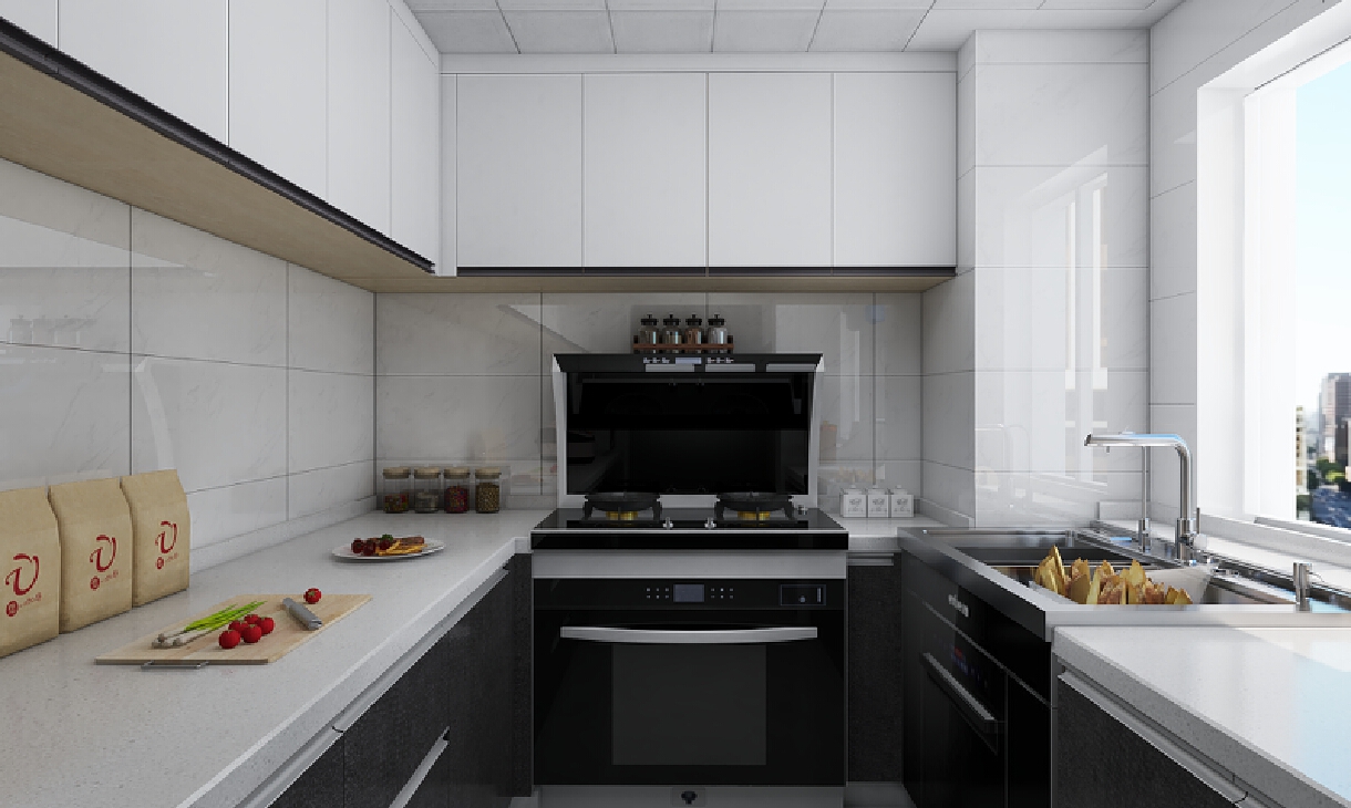 1.厨房简约大气,集成灶与集成水槽现代感强烈 2.拉手黑色显的稳重