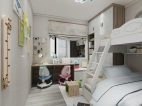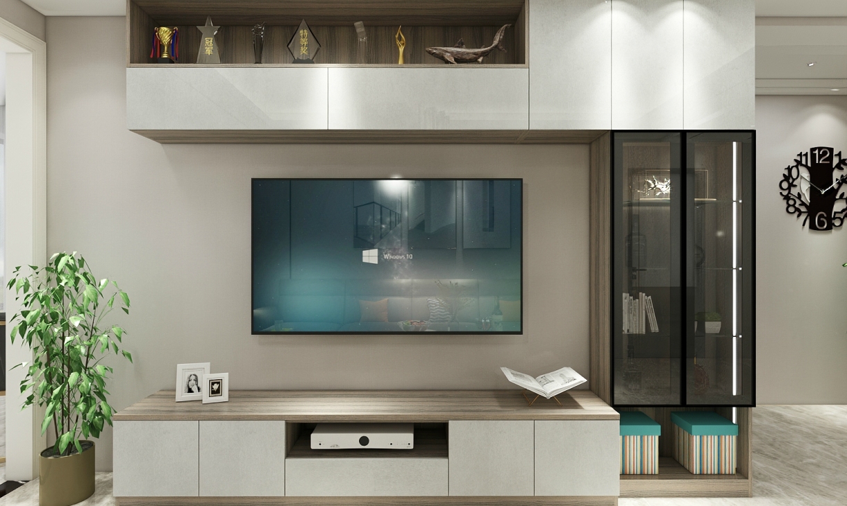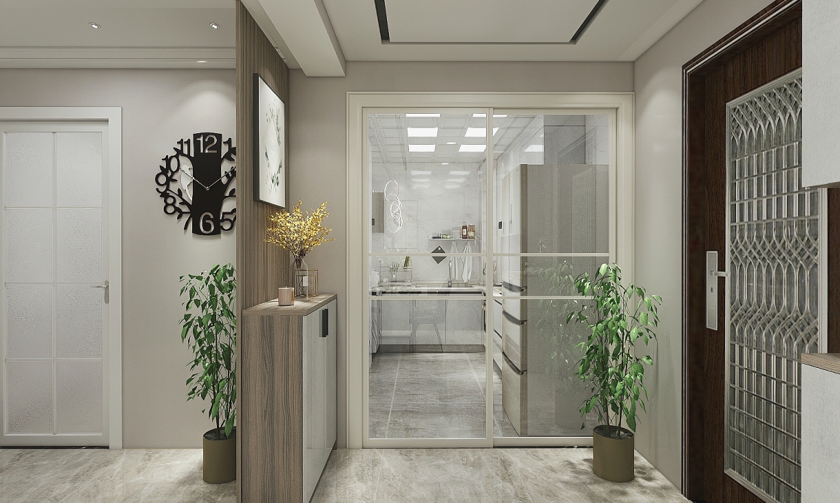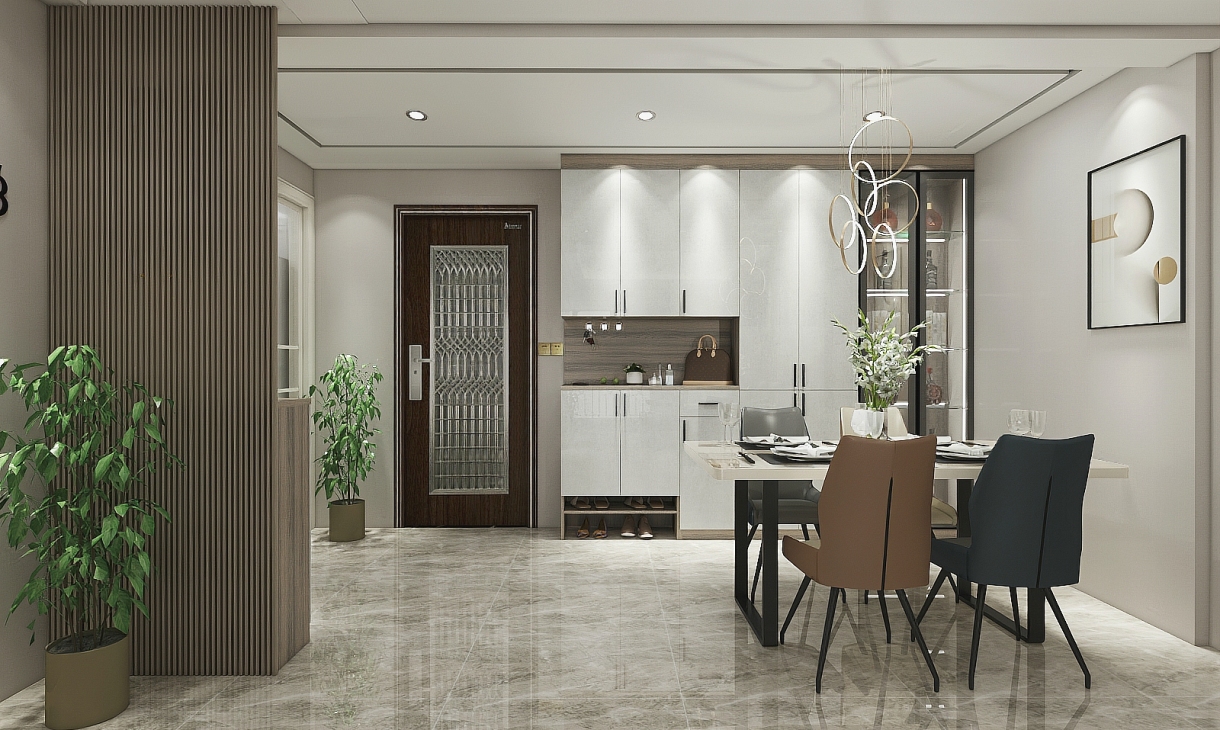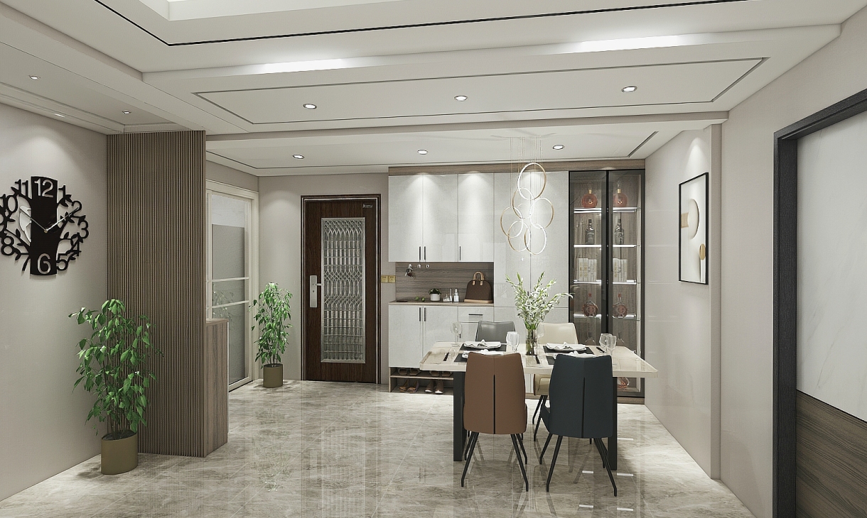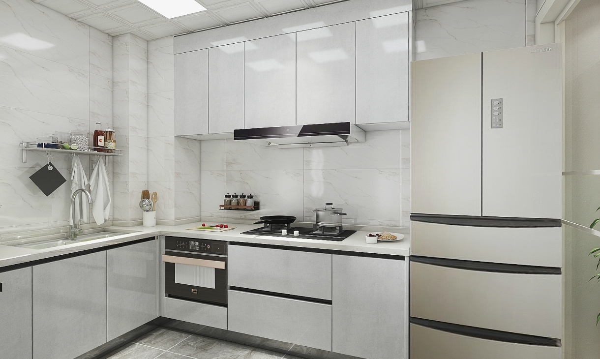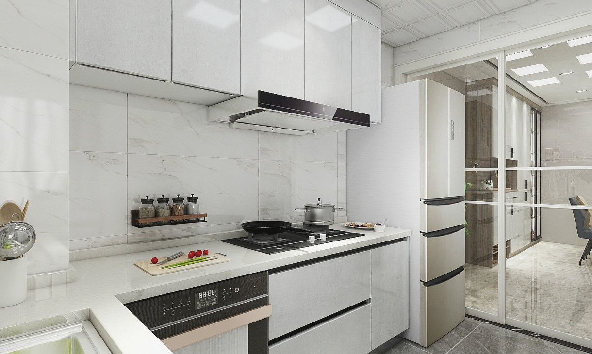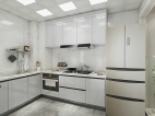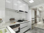 业主在广州,喜欢比较流行的风格,建议采用黑白灰,但是环境色还是以明亮为主。深色柜身,白色亮光柜门,灰色墙布,搭配金属线条,营造高级的黑白灰。