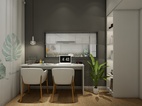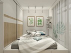 卧室考虑到收纳储物为一体,级满足了储物的需求也更大的节省了空间,大面积的白色柜体搭配原木色,舒适、自然,绿色的植物挂画给整个空间增添了生命力。书桌可以工作和梳妆同时使用,透过厨房玻璃窗的设计可以在工作时兼顾看厨房的状况。百叶窗帘拉下可为隐蔽状态。精致的吊灯、天堂鸟的摆放,使得整体氛围更为温馨、舒适。