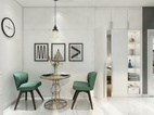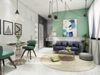 客厅以白色为主要色调,搭配绿色为点缀色,清晰自然,在空间上白色调为主也有拉伸的效果,不会显得小空间过于压抑。北欧的布艺沙发搭配编织地毯显得更加自然、舒适,搭配金属质感的茶几、灯饰等装饰增添了几分时尚感。阳光洒落、整个空间显得温暖、舒适。