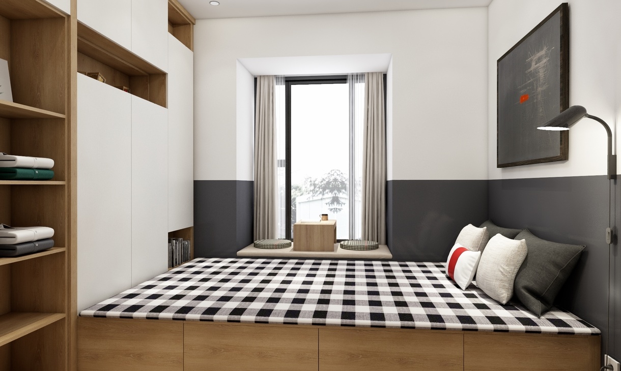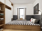 客卧用了榻榻米形式的做,收纳功能十足。飘窗那放了个小桌子,可与朋友在那休憩的看书、饮茶,感叹美好休闲的时光。闲暇时主人有朋友来玩,也方便留人过夜。