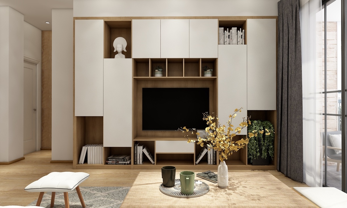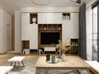 客厅沙发的背景墙其实是餐厅的展示柜,特意在中间定制了高柜分隔成两个空间(客厅与餐厅)。而客厅的电视柜在梁的下方做成整柜,收纳与展示的功能都齐全。