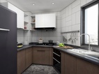 在这异形厨房里,空间虽小,但设计师也布置了让屋主按洗切煮顺序的区域。上方的吊柜以白色为主,是因砖是白色,想整体一致。