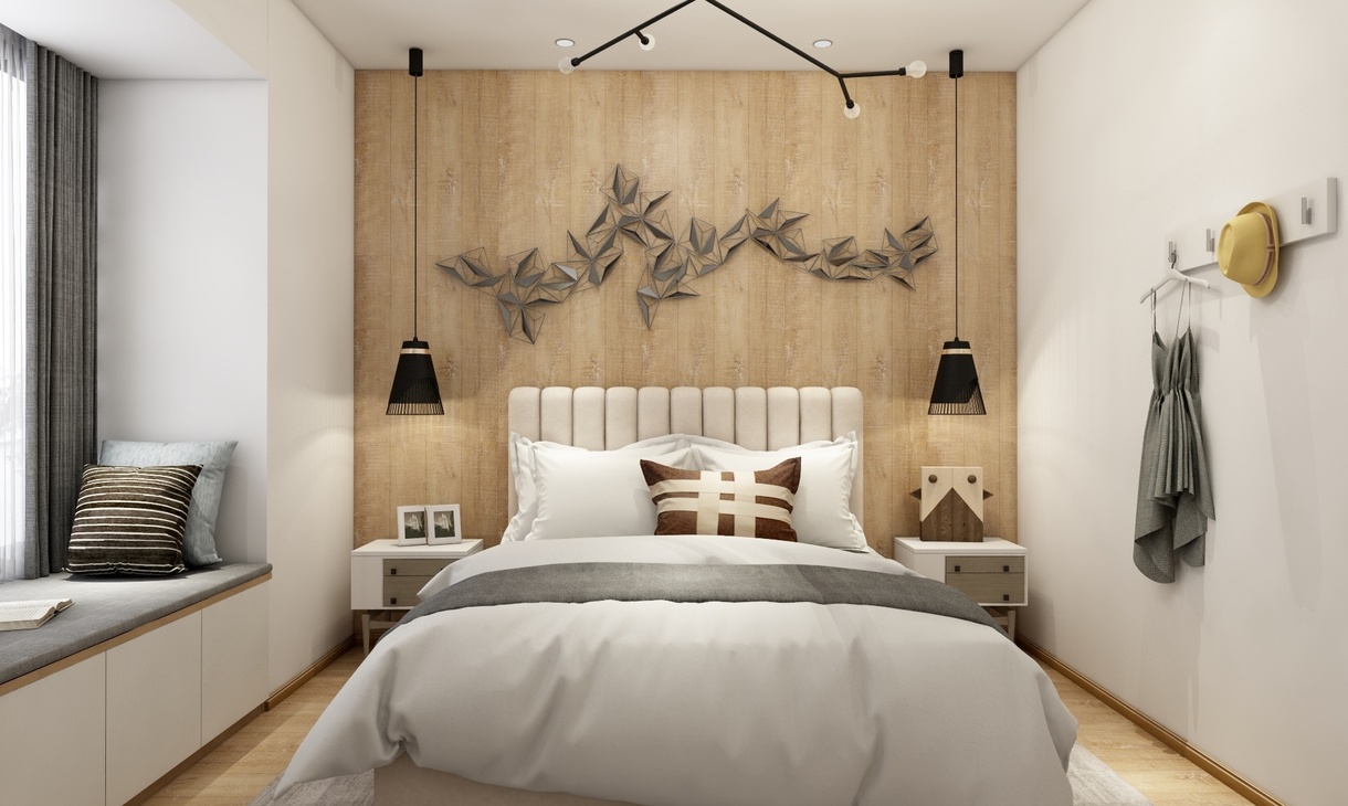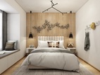 次卧的摆饰就相对于其他空间简易些,床头背景墙用了木质的地板铺设,与地板一致。进门右侧放了挂衣钩,方便进出房可以随身挂起、取走。