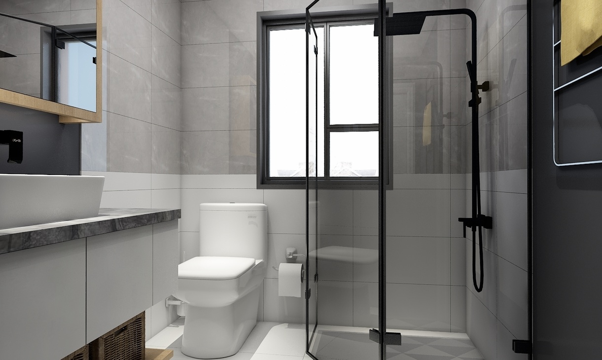 卫生间地砖区分了两个空间:干区与湿区的空间。而干区的地砖以几何铺设,整体北欧范十足。