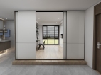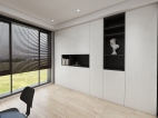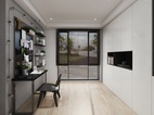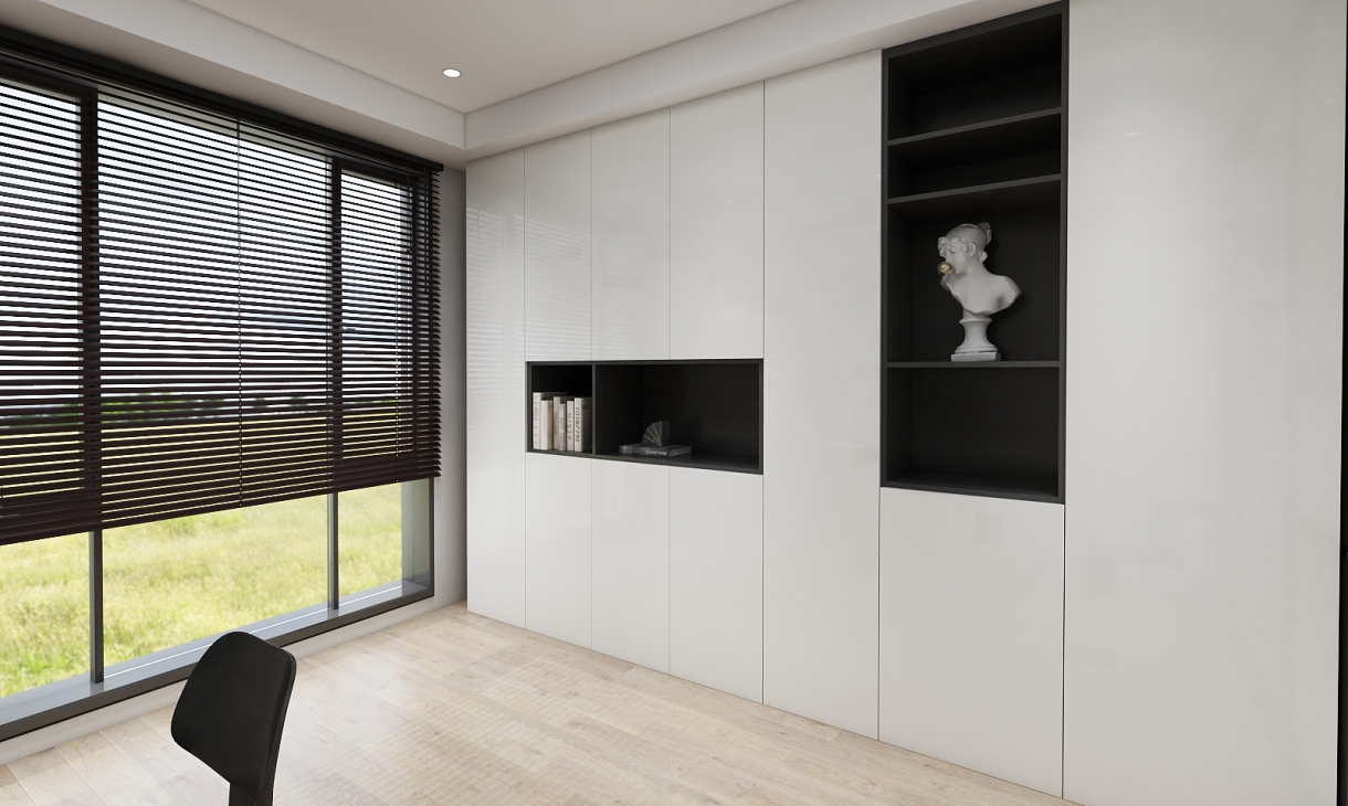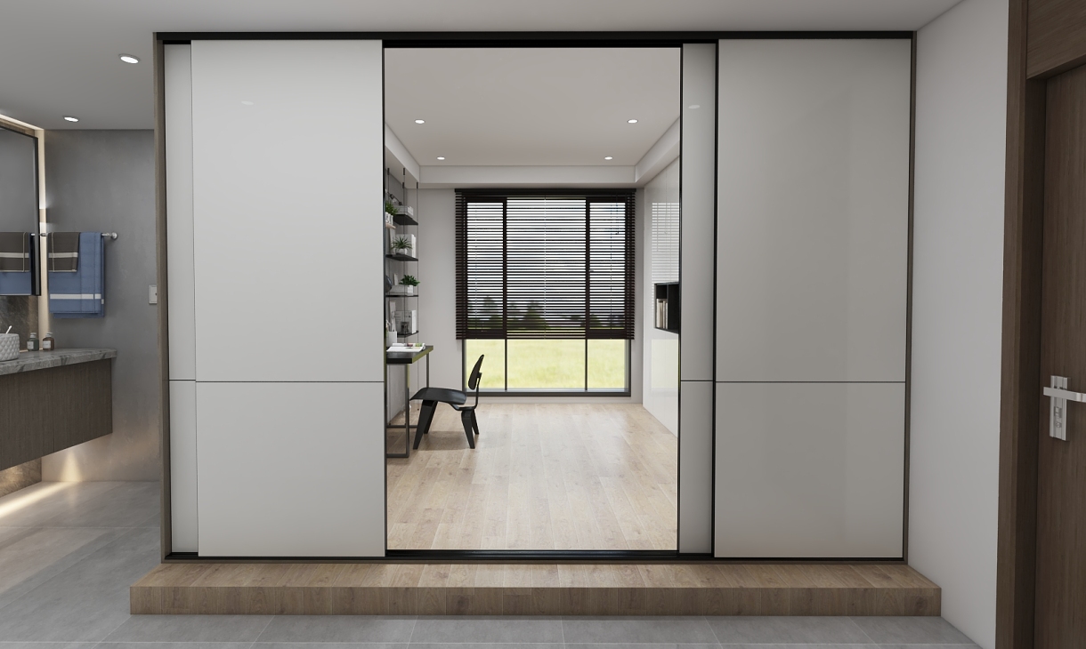 这是移门在移动瞬间的照片,能看到这个白色推拉门移门对这个空间的重要性。 这是书房打开的样子,白色推拉门移门,这就是个开放式的空间。