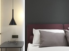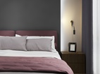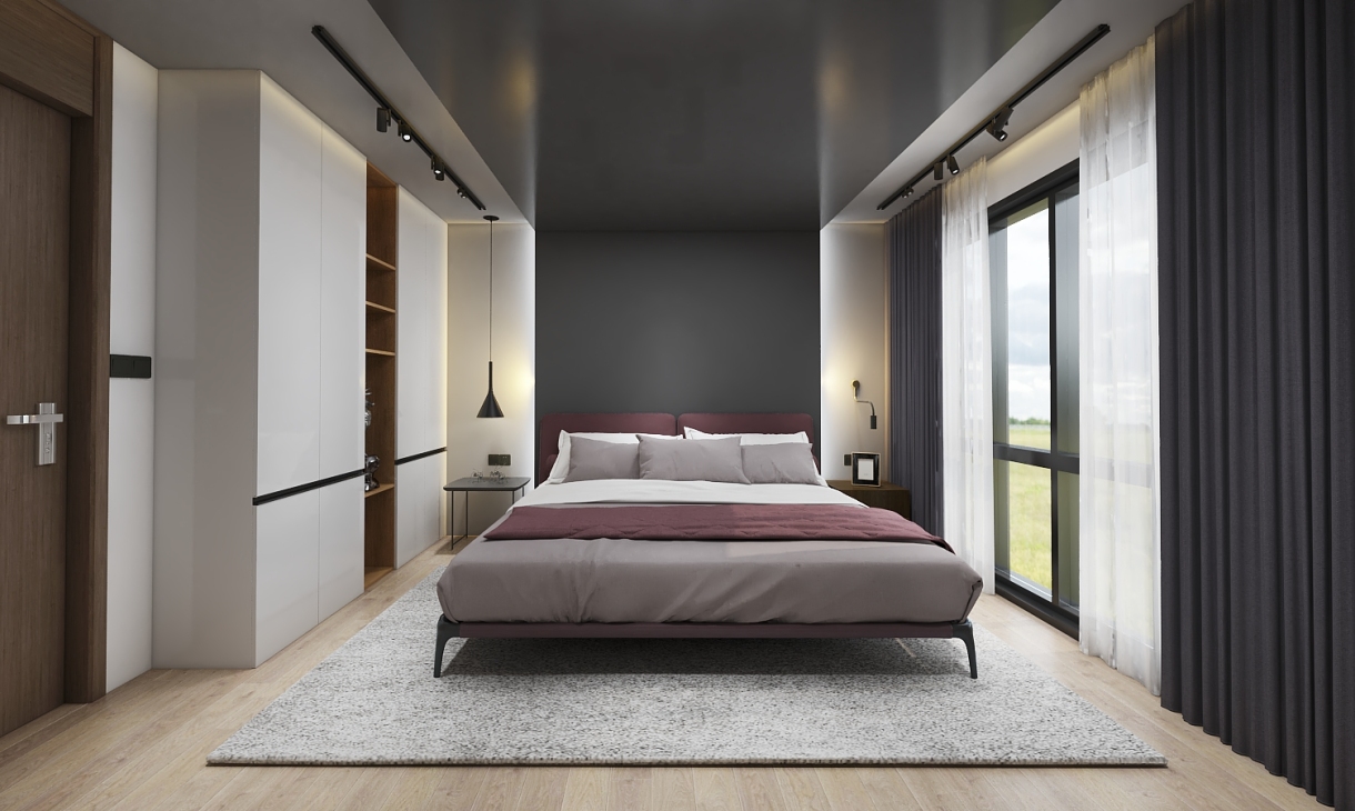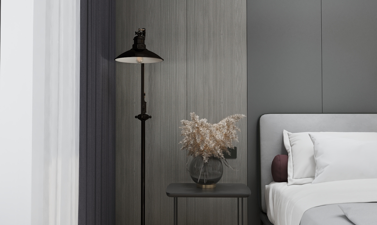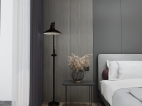 整体,素雅色系为主,落地灯和床头纯黑镂空金属床头柜,木饰面用的也是比较经典的色系。 黑色床头背景和单人椅子呼应,黑色窗帘也能让进户的光线更加柔和。