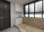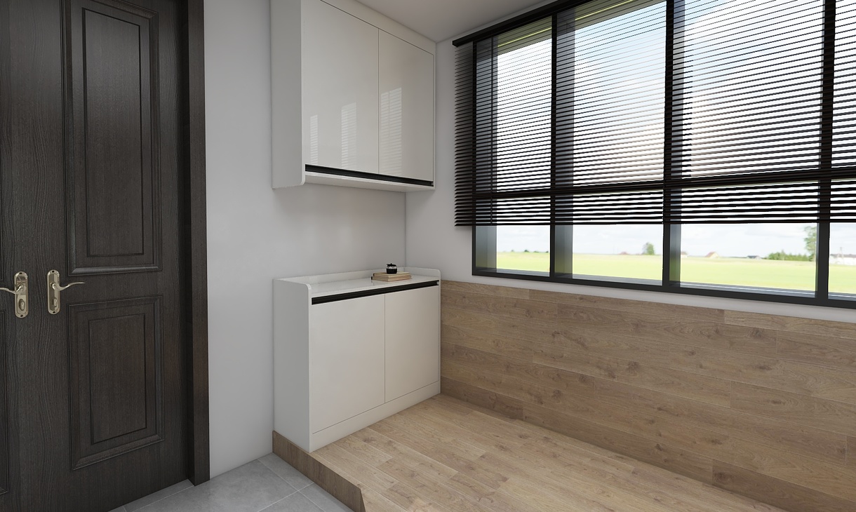 进门本来是入户花园,后期内包成室内的一部分,地板上墙还做了地台。 这是主人进户,换鞋、整理的过渡区域。