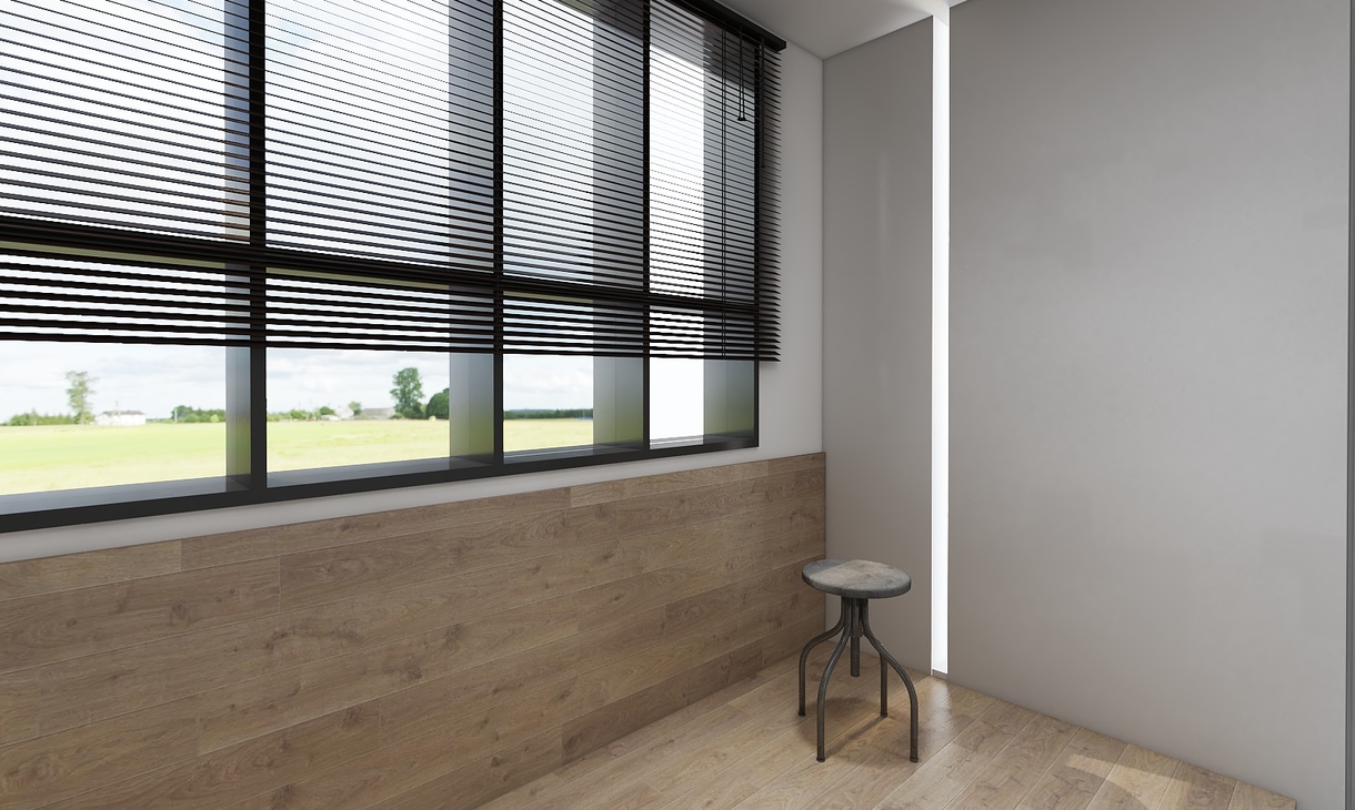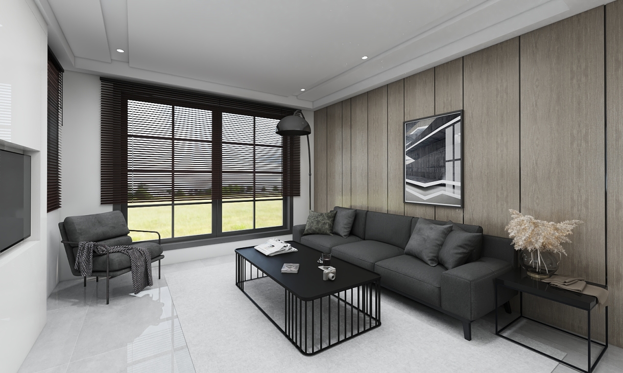窗帘是少见的黑百叶帘,代替普通布质窗帘,不论阳光或是用灯光, 光线都可以比较适宜。主茶几买自线性公园。