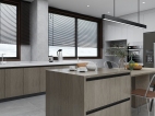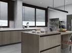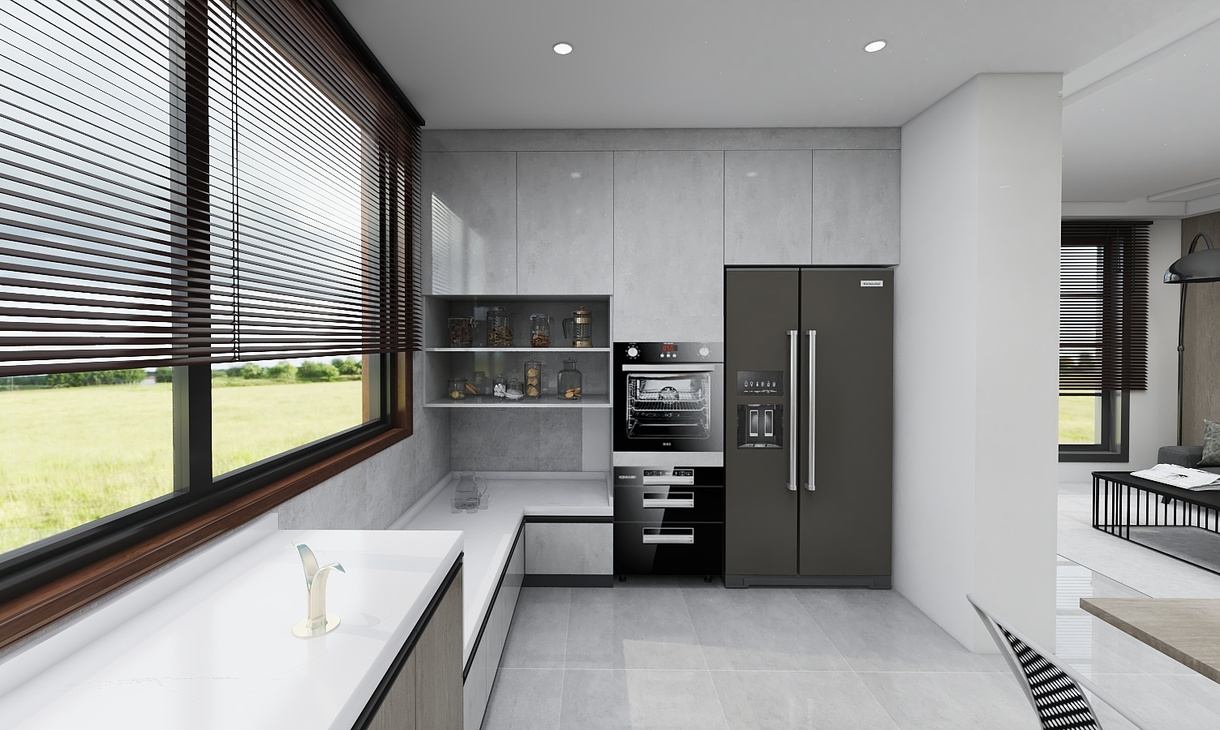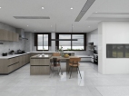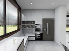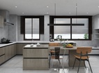 灰色的瓷砖,质感很强烈,整体深色调能保持在一个色系内。 厨房橱柜选的是科勒的高科技系列很符合业主的烹饪要求。