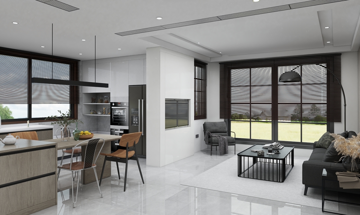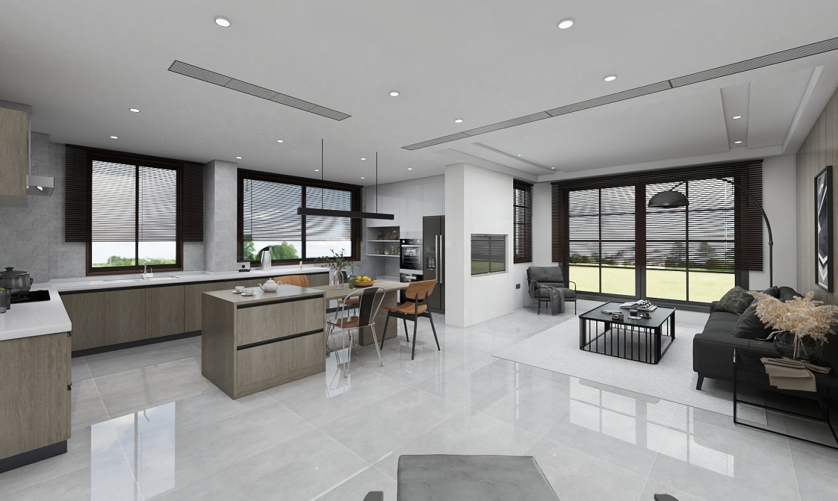 把客厅,餐厅融合到一起,大空间,让视觉更通透,还有吊顶的超宽百叶空调出风口。
