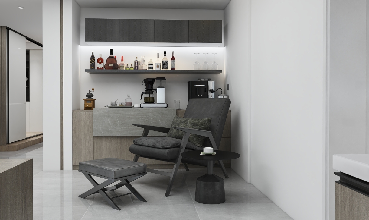 进门后中岛位置望向客厅的角度,沙发是包豪斯的,餐厅灯是SEED的横条灯。空间上还是开放状态。 进门的右侧还有一个酒柜区域,这可是个衍生的区域,满足业主闲暇的时候喝点小酒, 制作咖啡的空间,还有一把可以躺着无比舒适的躺椅。满足感爆棚。