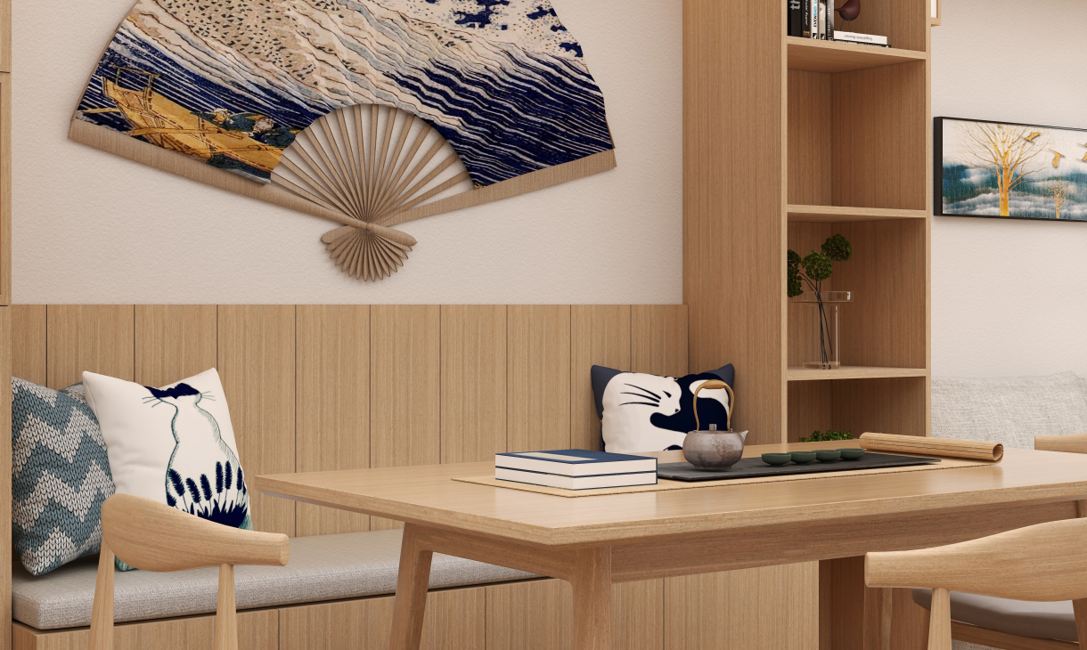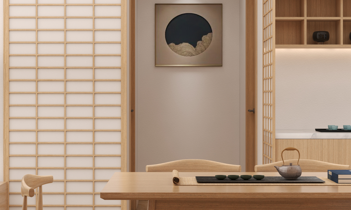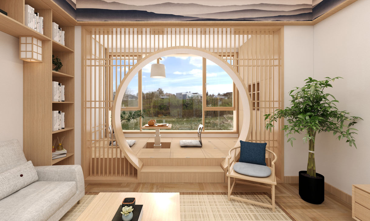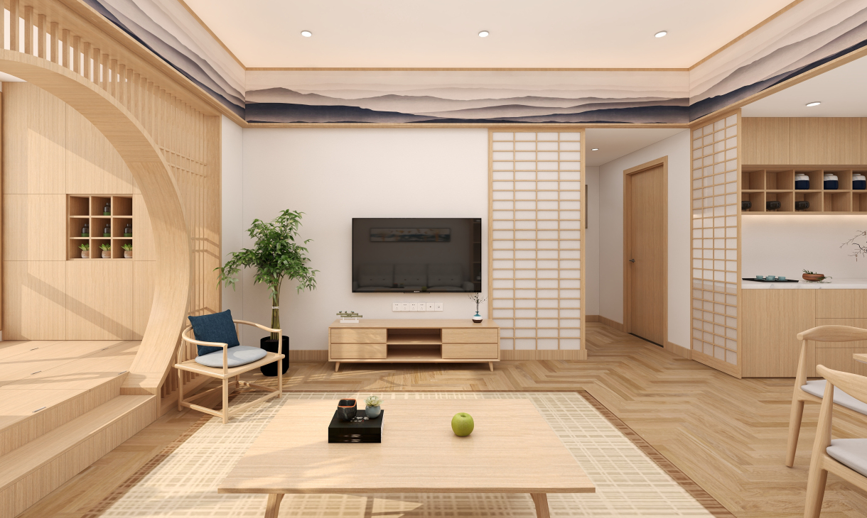 想要营造出日式禅意的客厅,客厅一定要以实木元素为主,原木色家具为辅。当清早的阳光洒入室内,远处的绿植透过木栅格,倒映着的窸窣的影子印在客厅的客厅角落,微风徐徐入堂。