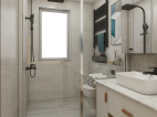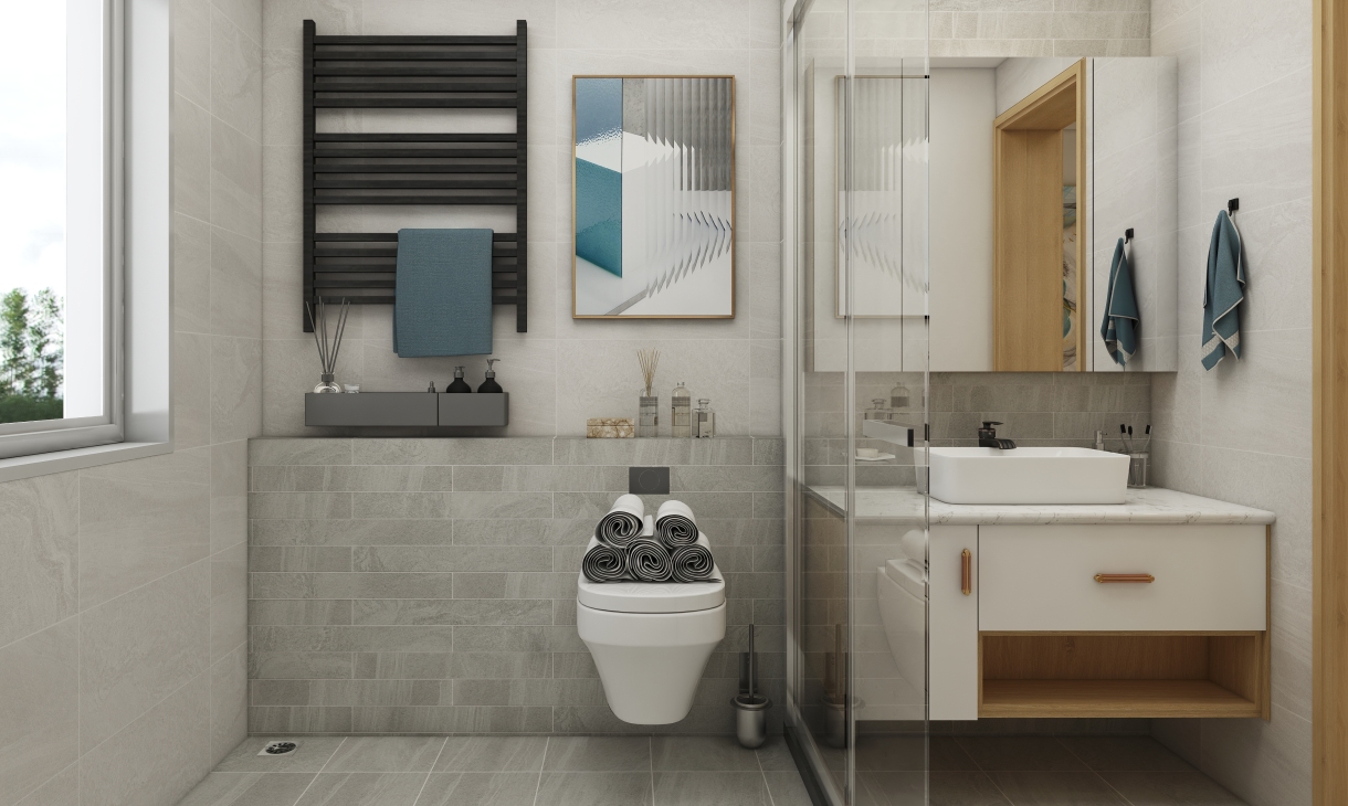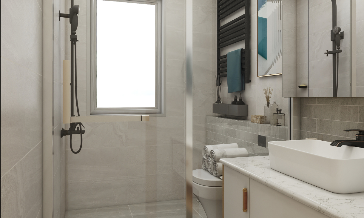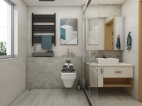 卫生间浴室柜后面有一面承重墙,为了修饰这面墙角,整个延伸,做嵌入式的马桶,方便便捷。利用好台面放置物品,充分点缀空间,让这个小空间很充实,精致。配合亚光面的瓷砖更加有质感。