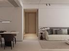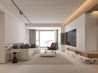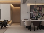 黑白灰基调的极简主义搭配大面积原木色木作和暖调灯光,让整个空间充满秩序感,再点缀迷人的波尔多红色边几和单椅,增加一些活力感,餐厅采用现代抽象艺术挂画,强烈的颜色对比延伸至餐椅的色彩搭配上。