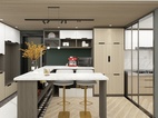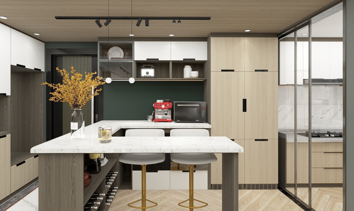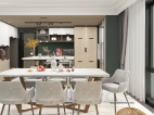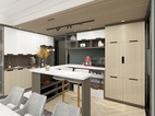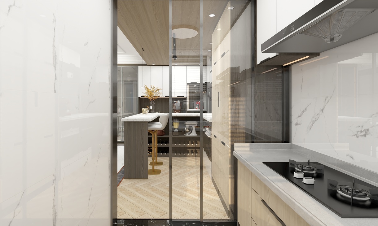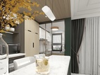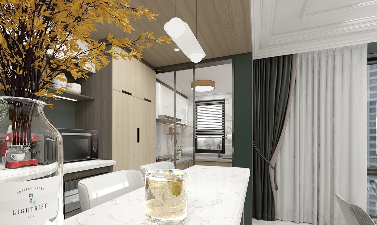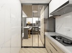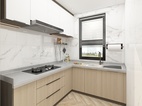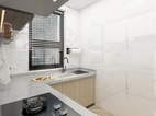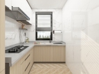 将原本长条形的厨房拆除墙体,改造成中西两用厨房。中厨采用移门隔断,冰箱为嵌入式,增加了橱柜整体美观性。地面采用西厨木纹砖,打造木系生活