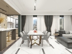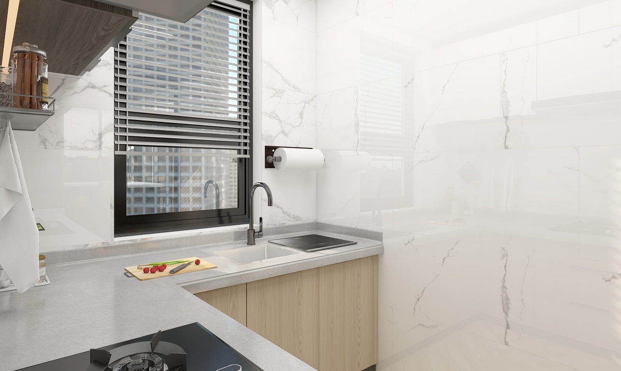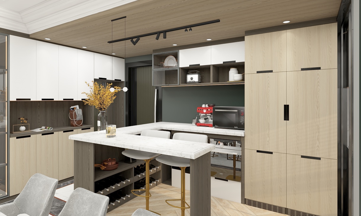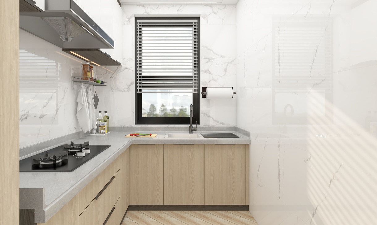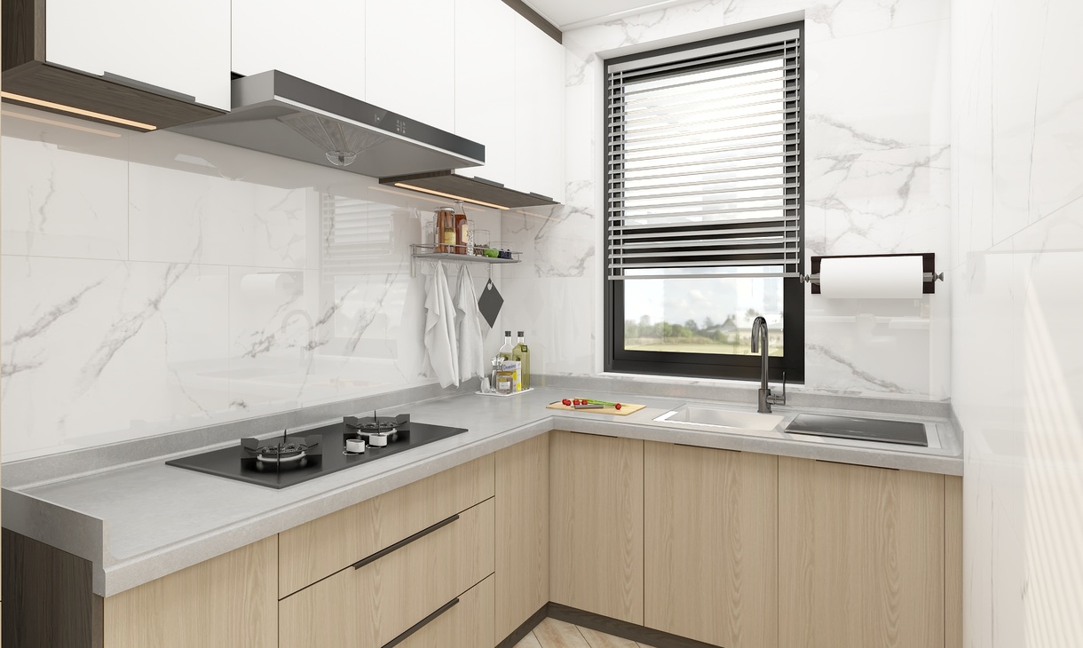 将原本长条形的厨房拆除墙体,改造成中西两用厨房。中厨采用移门隔断,冰箱为嵌入式,增加了橱柜整体美观性。地面采用西厨木纹砖,打造木系生活