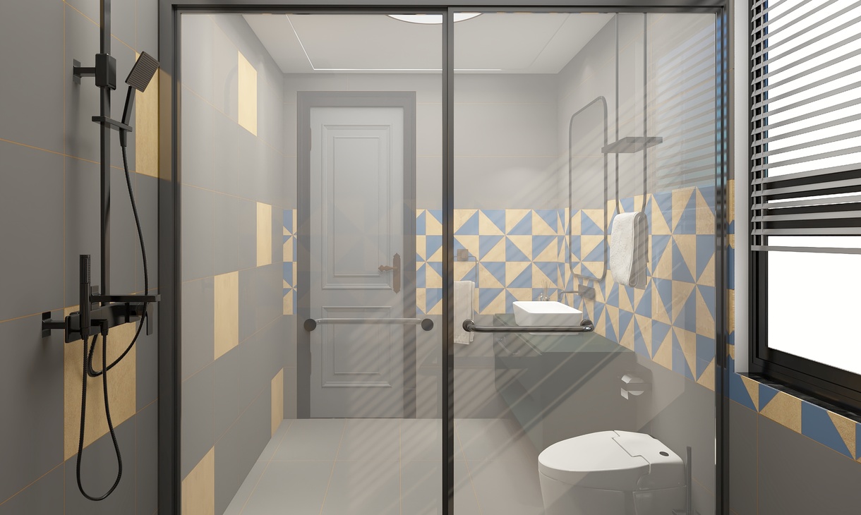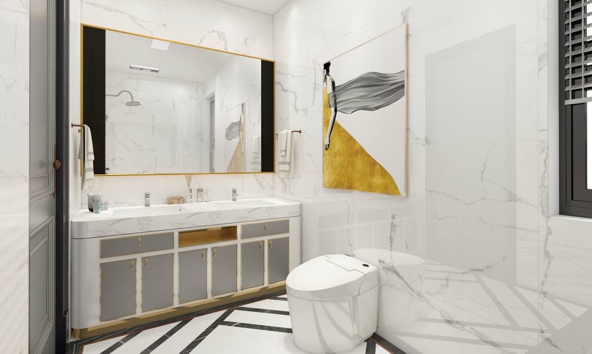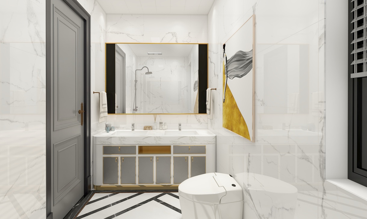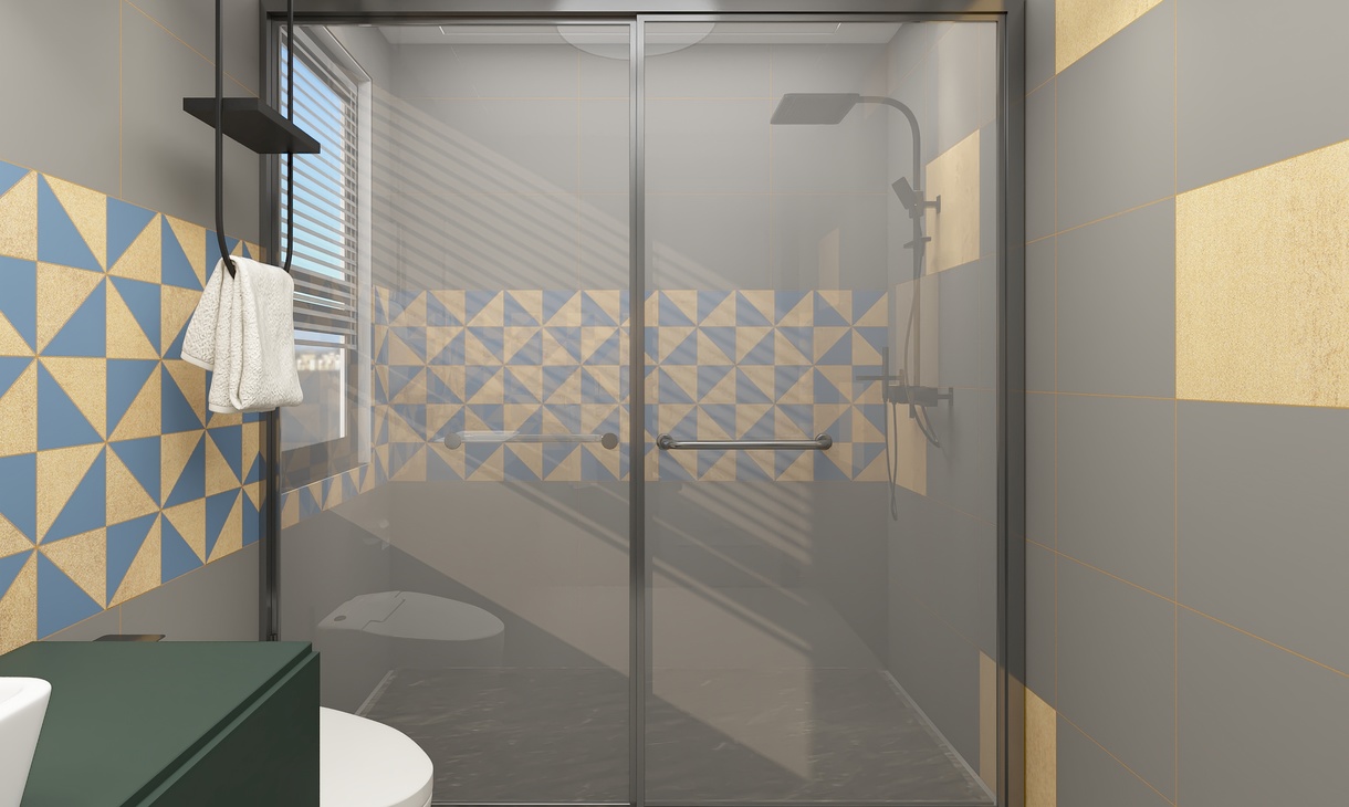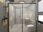 公卫整体马卡龙灰色调墙地砖,搭配造型腰线。工业风黑色五金洁具,使整体空间更有质感