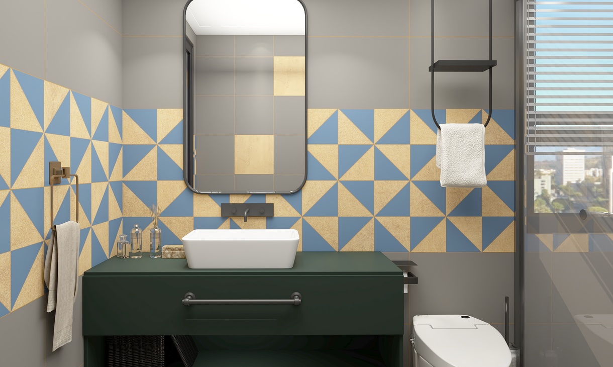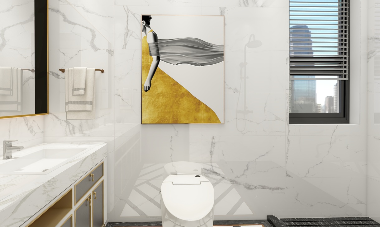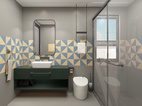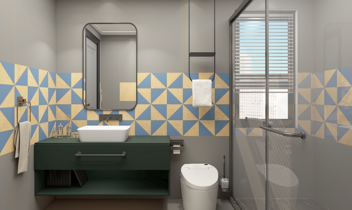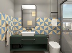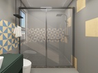 公卫整体马卡龙灰色调墙地砖,搭配造型腰线。工业风黑色五金洁具,使整体空间更有质感