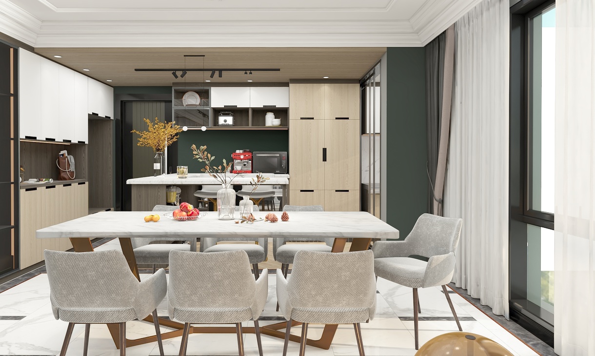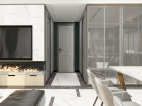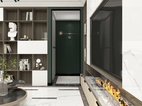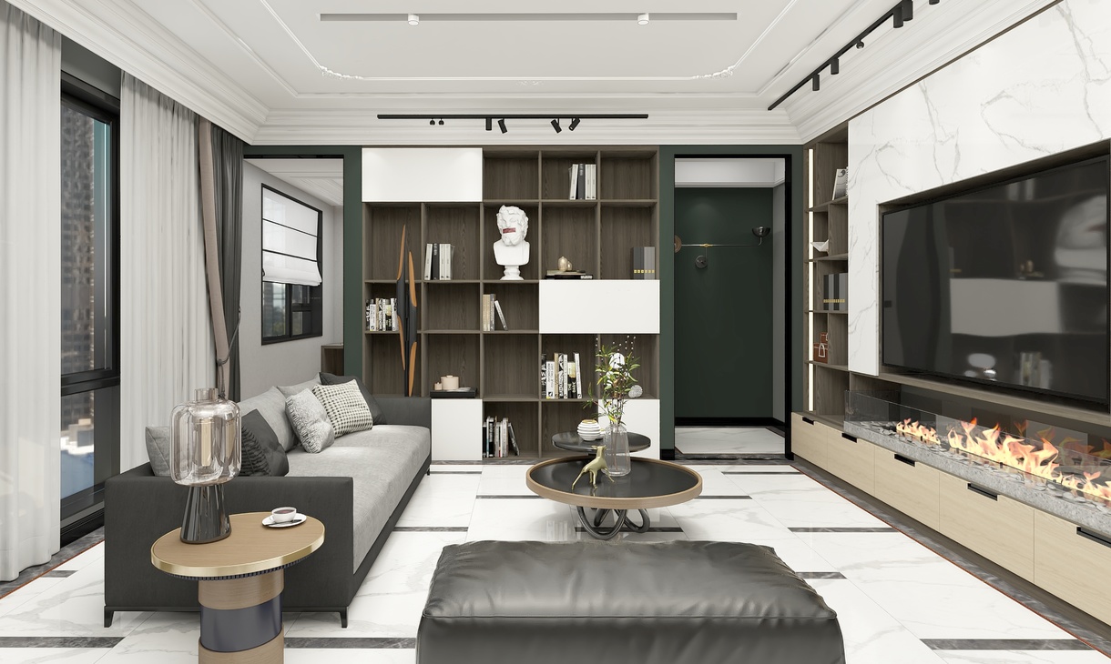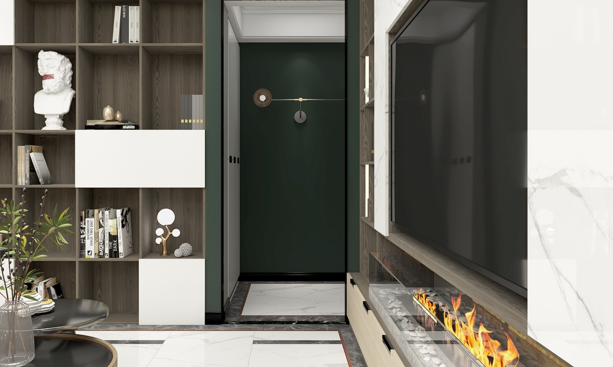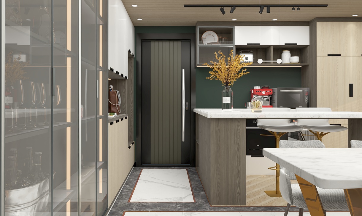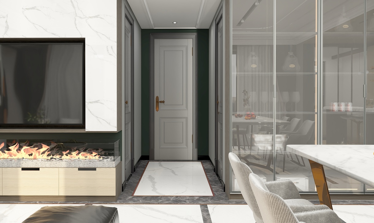 墨绿色的乳胶漆墙面,搭配木色系定制柜。地面在玄关和过道处做地面分割,镶嵌玫瑰金铜条