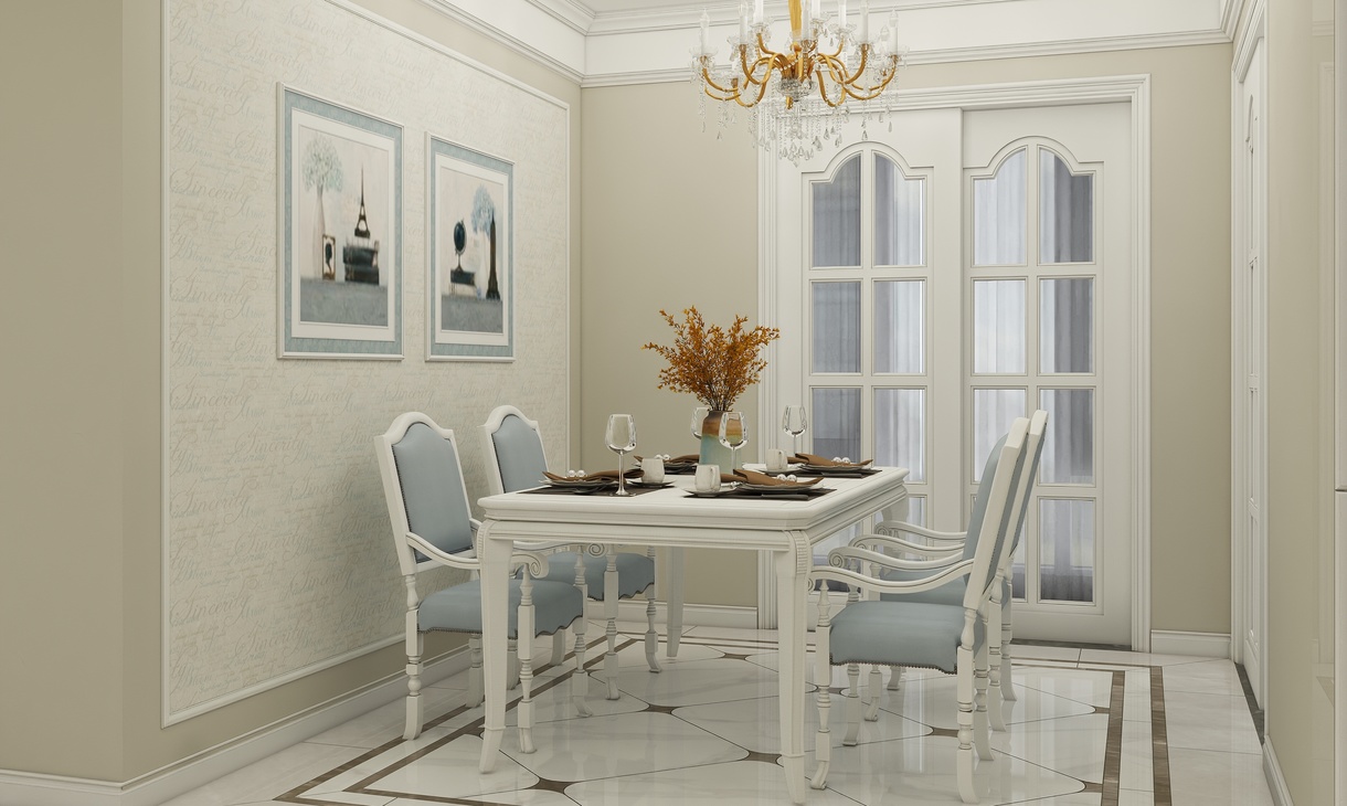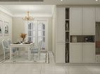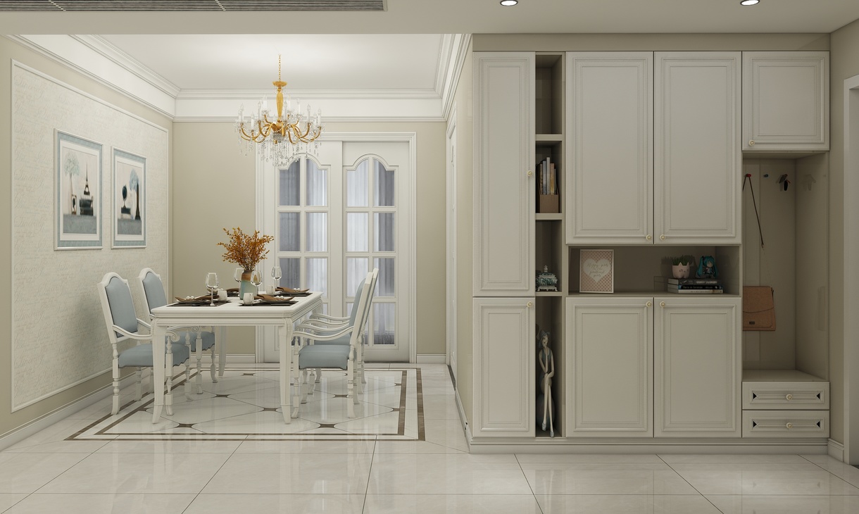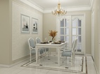 餐厅以暖色为主,从地砖选择就是一暖灰色的主砖去搭配经典的鱼肚白做跳色。