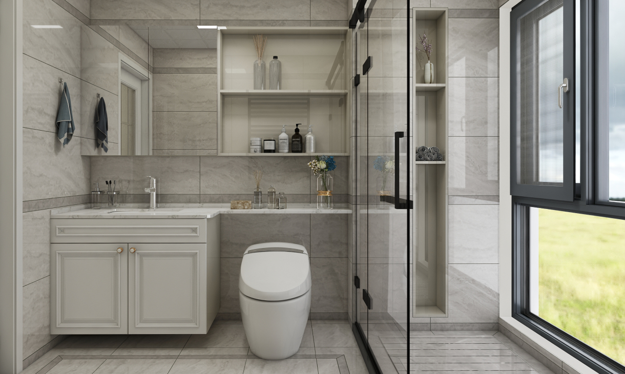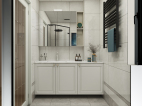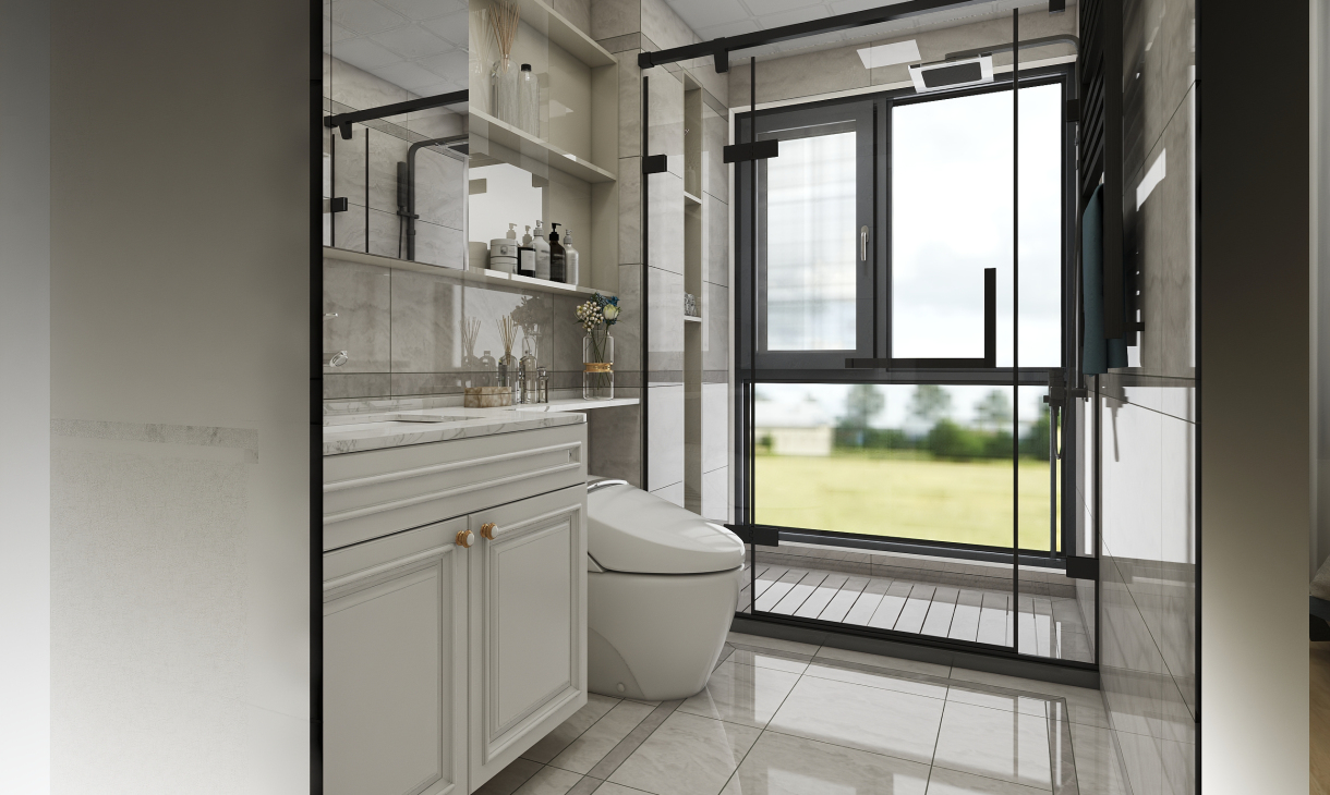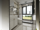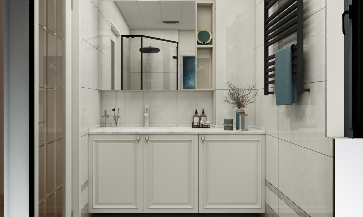 卫生间色调的选择,以带有灵动感的大理石纹理的瓷砖做主色,搭配一点点深色的配色,活跃整个公卫的气氛