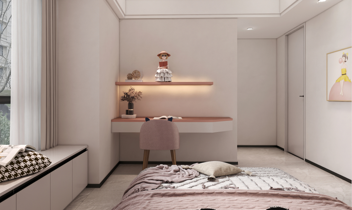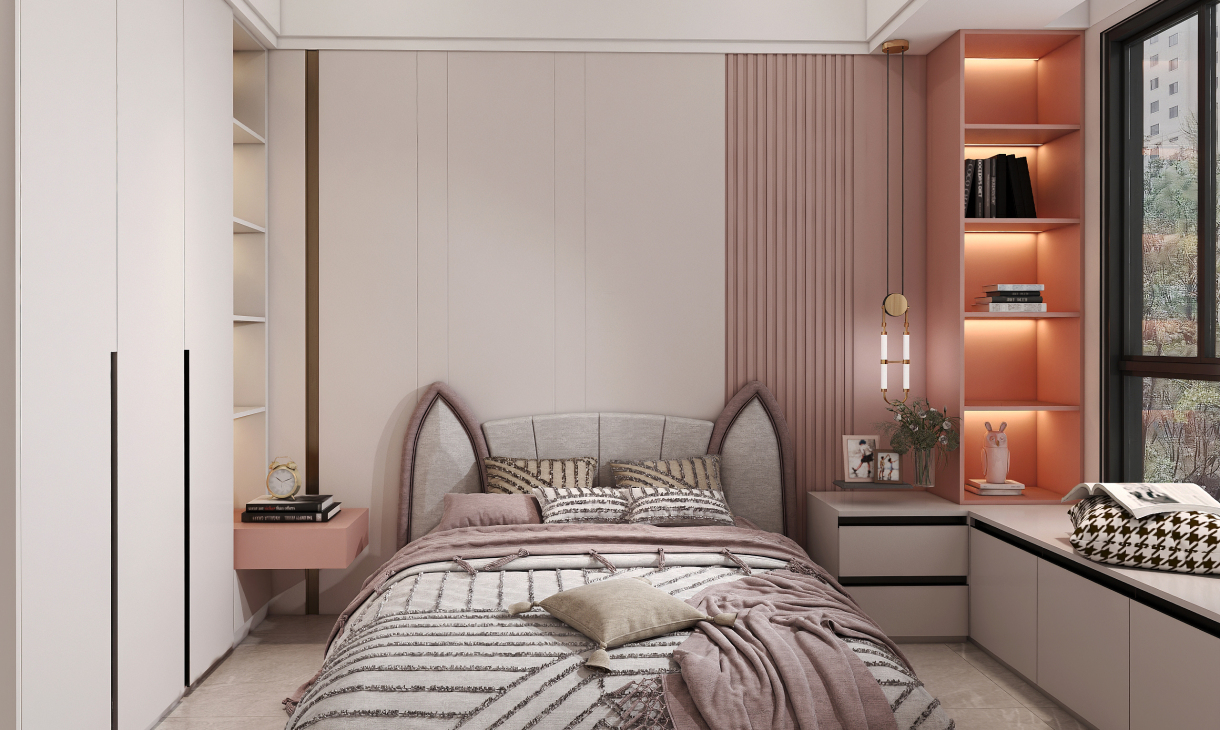 儿童房粉白背景墙,恬静素雅,在此基础上搭配俏皮活泼的装饰,明朗雅致,清新明快。