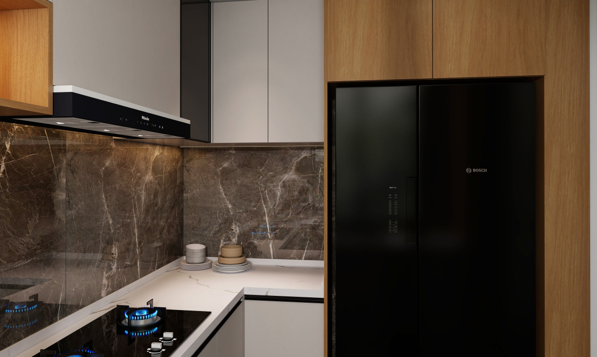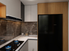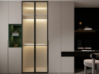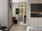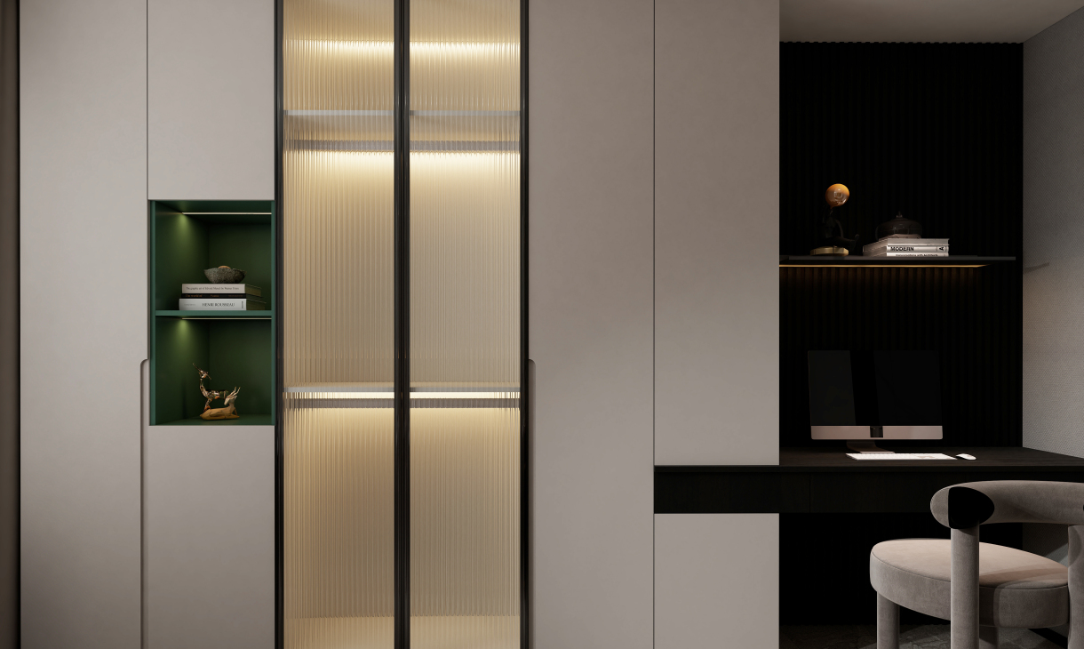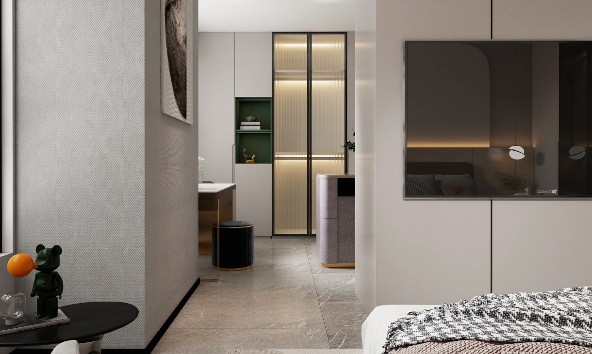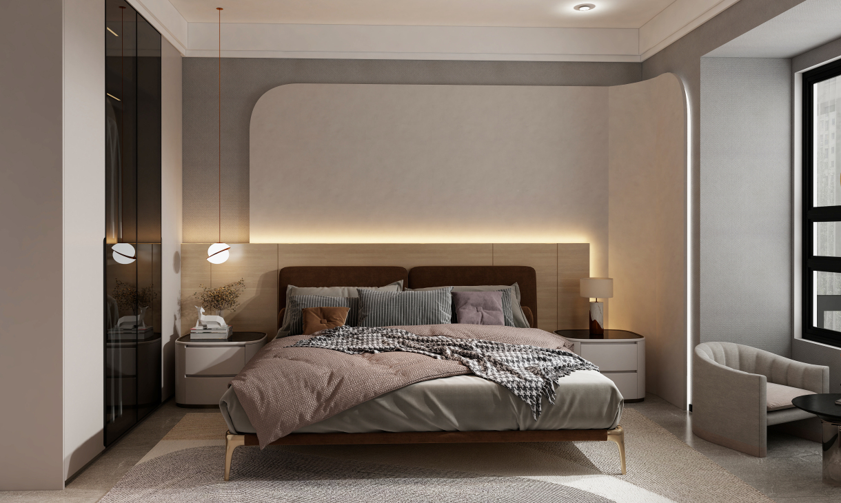 对称的佈局勾勒典雅与气韵,疏落有致的线条排布谱写具节奏感的空间韵律,米调扪皮背墙与木饰面墙身间隔拼接
