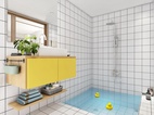 卫生间采用白瓷砖+柠檬黄的色彩搭配,在白色起到视觉扩大效果的同时,柠檬黄的清新也点缀进来,使小空间富有生气。由于卫生间在搭建的高台之上,屋主便也能体验专为小户型打造的嵌入式浴缸带来的舒适享受~
