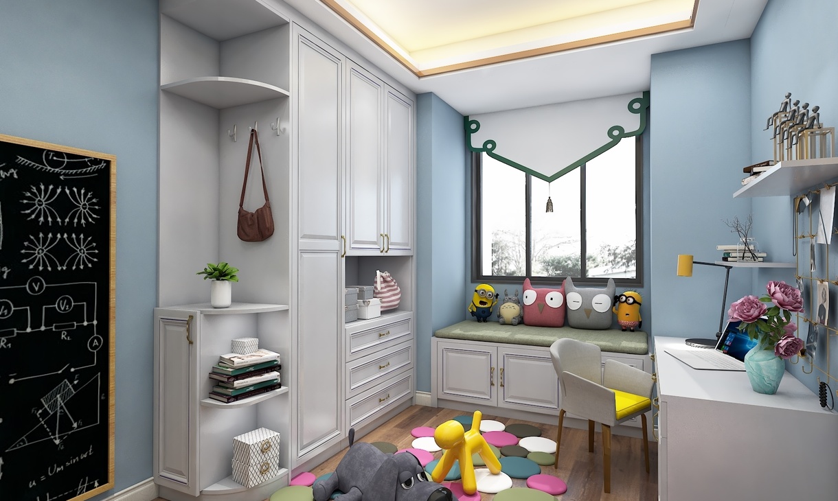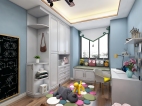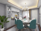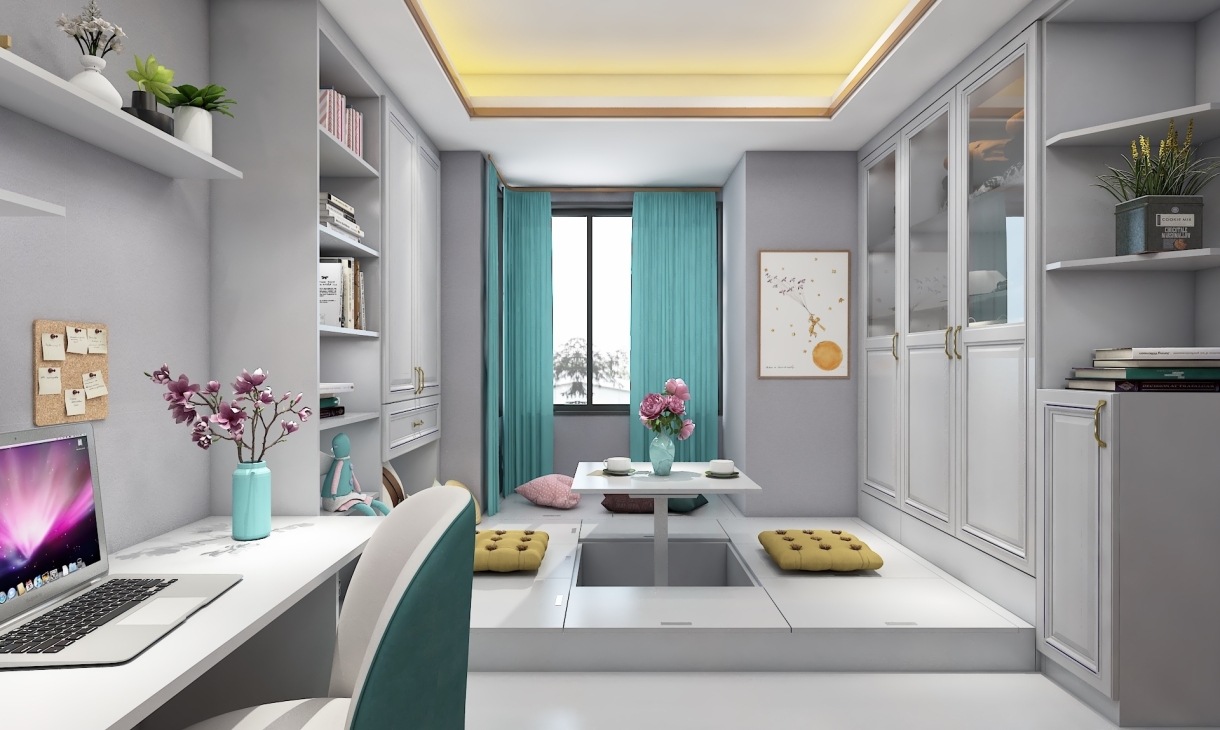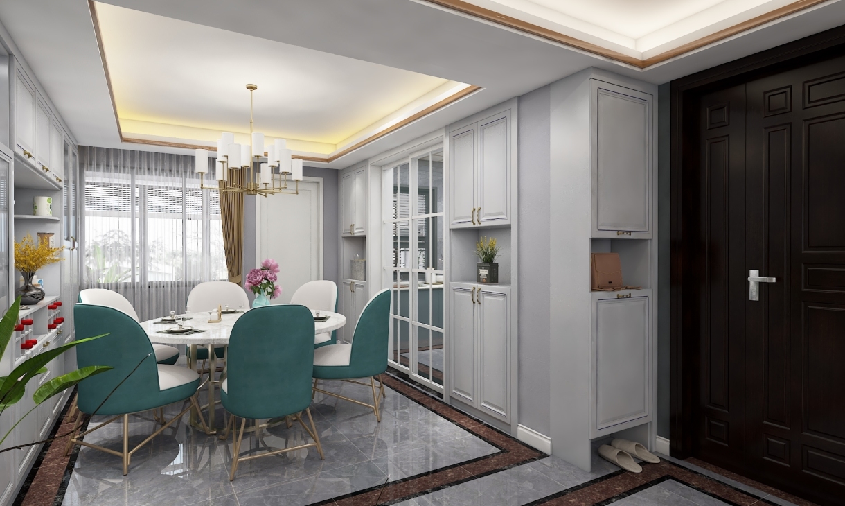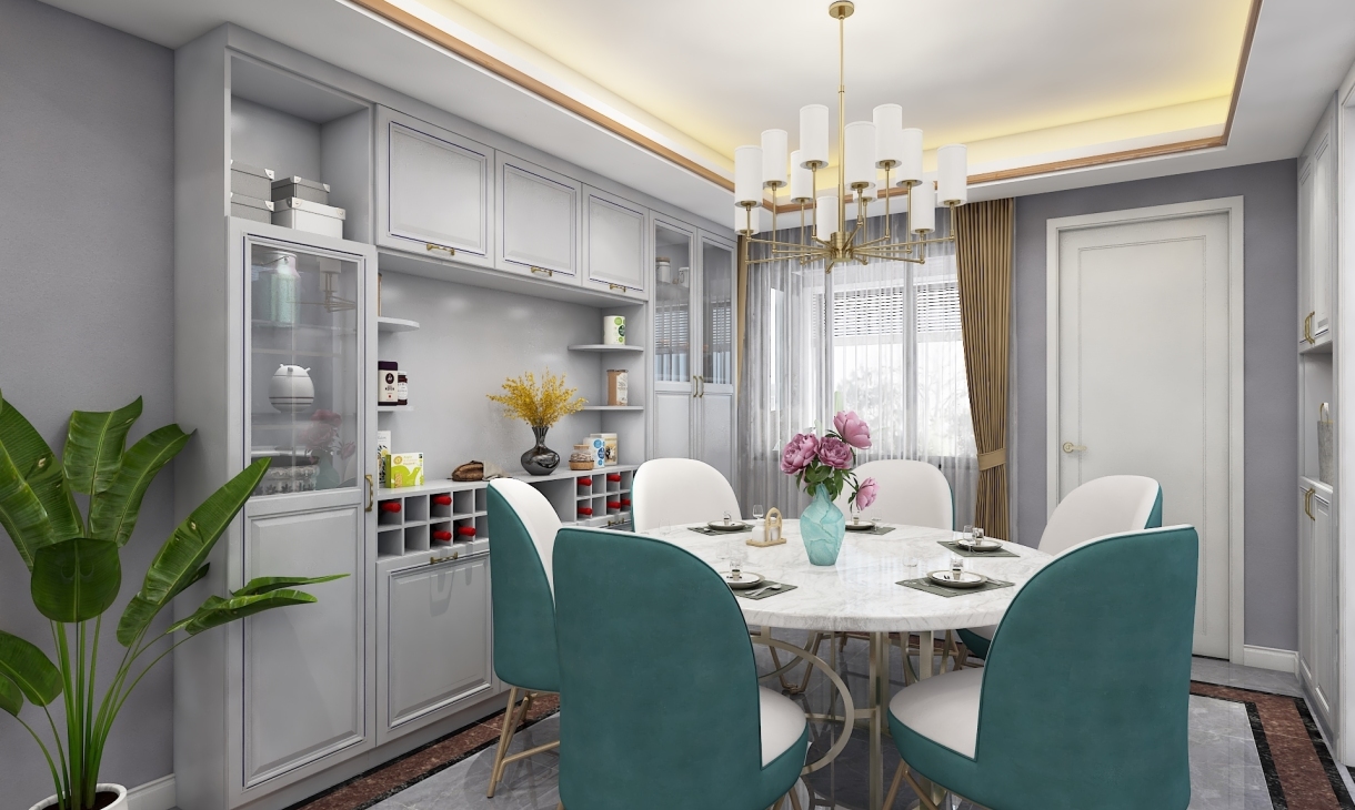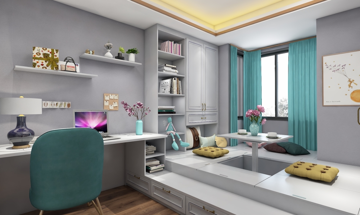 以“绿野仙踪”为主题,整体风格是现代轻奢,融入有“温度”的色彩,如孔雀蓝、松石绿、樱花紫、蒂芙尼蓝等颜色,会给家人带来开心和愉悦,同时也表现出对生活乐观、自由、无所畏惧的态度,给整个空间赋予生命,是女主人最大的满足。 入户空间较小,打掉厨房墙体,做两组内嵌式柜体,一组作为鞋柜来使用,扩大了鞋柜的储存量,靠近阳台的一组作为餐边柜来使用,同时餐厅另一边也做了一组餐桌高柜,有露有藏,满足餐厅物品的收纳,玻璃门的设计使得餐厅空间更为通透,与餐桌齐平的高度设计了开放格,可设计插座与USB接口,在餐桌上临时工作时可方便电脑与手机的通电;书房做了一组榻榻米+书柜+书柜+衣柜的组合柜,榻榻米设计了升降台与高低台阶,平时可作为书房、茶室使用,有客人时也可作为客卧使用;主卧与次卧都设计了梳妆台+飘窗+衣柜,可收纳卧室里的小物件、衣物,飘窗可满足休闲阅读的功能;客厅设计一组差大的电视柜,可满足一家公共物品的收纳,如书籍、药品、影集、纪念品等;卫生间做到了干湿分类,洗手池设计在外面,即使是早上使用卫生间的高峰期,也可满足两人同时使用。