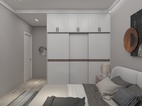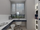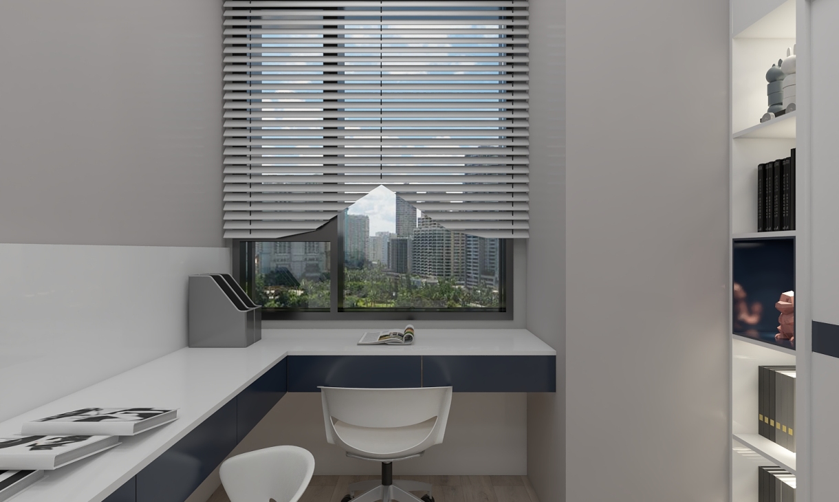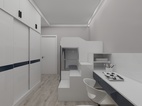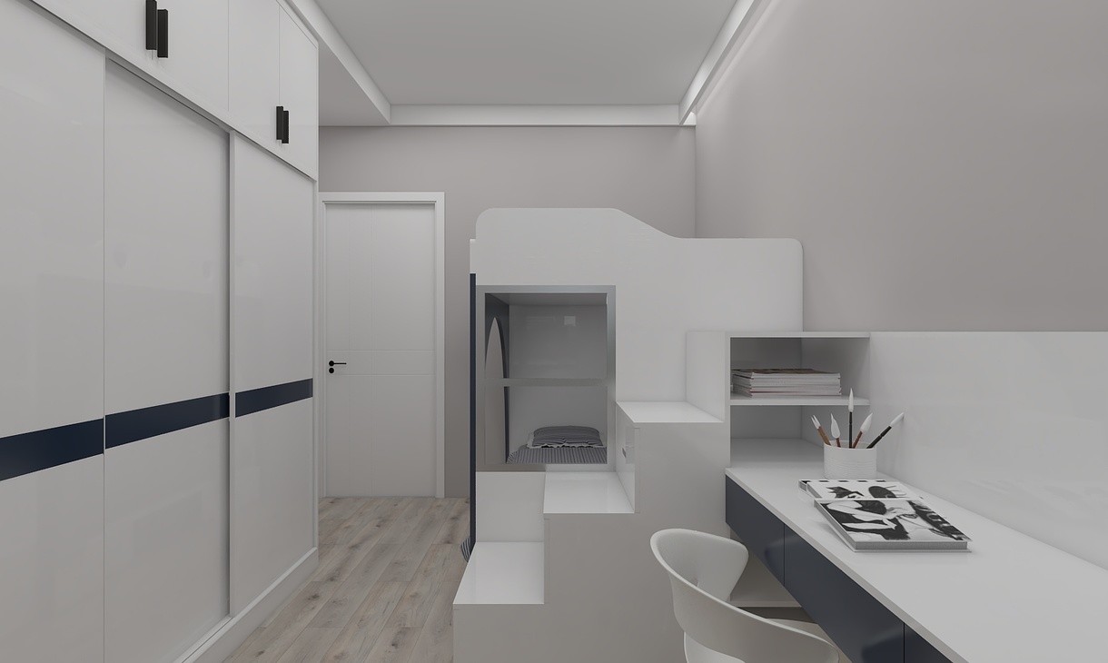 小孩房设计,采用了上下床设计,配套衣柜/书桌。整体颜色白色作主调,深蓝色作点缀