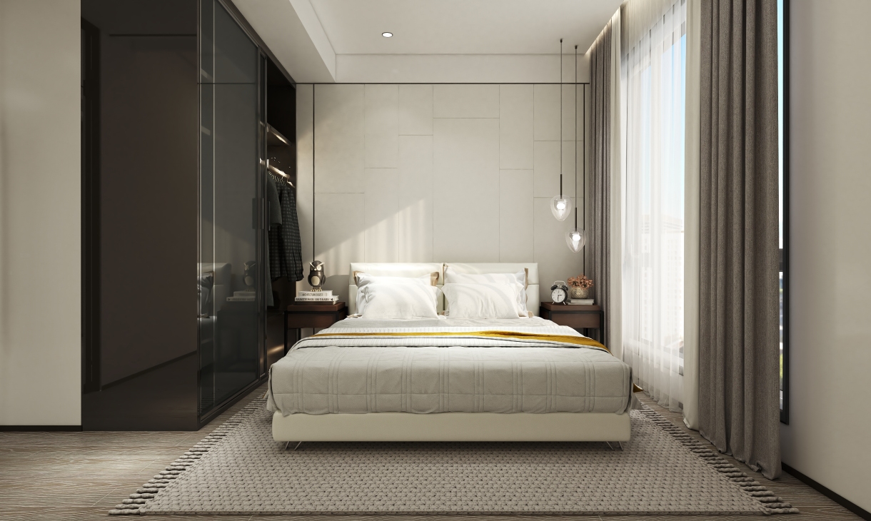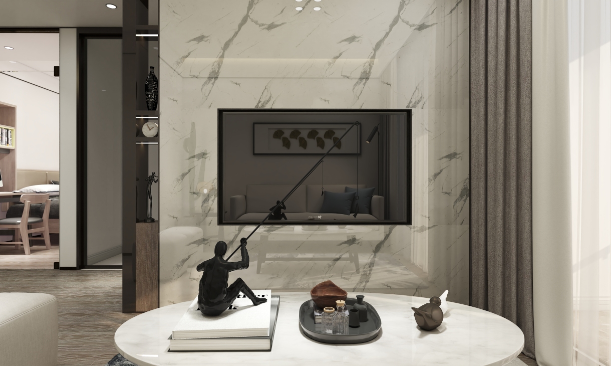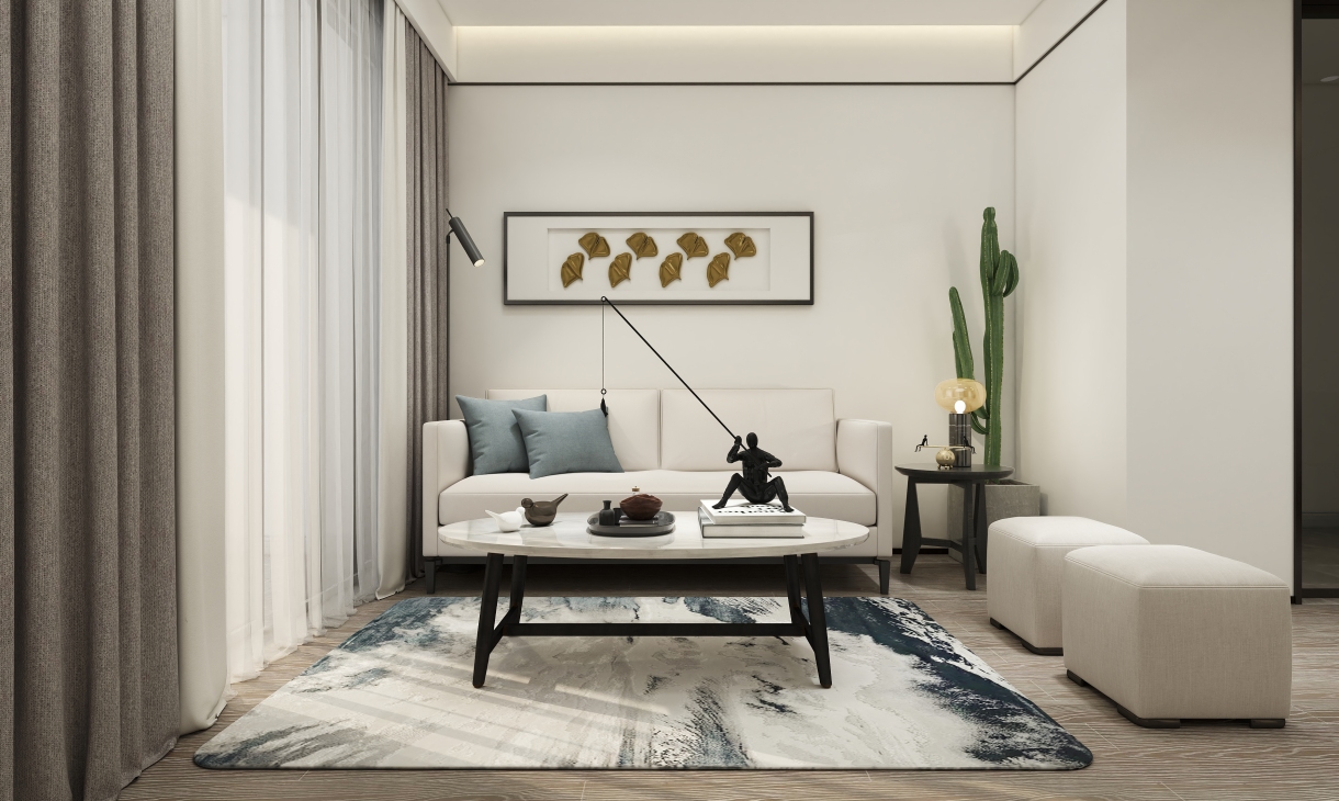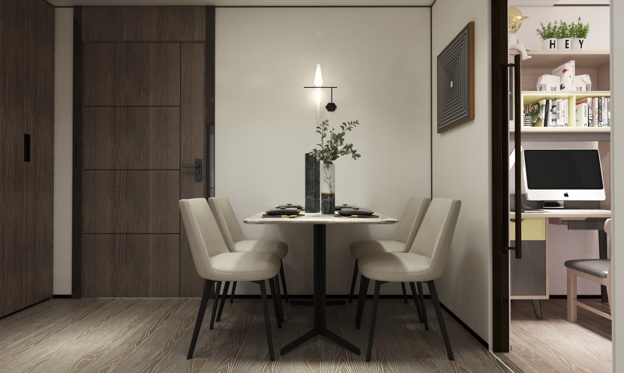 户型为两居室空间,功能完整,采光通透,适合小家庭居住,精致简易的装修效果,无主灯及暗藏灯带的设计及大理石元素的电视背景,空间更显高级时尚。整体设计以现代风格为主,能充分利用现有的装修条件,去融入较完整的设计语言。现代风格为一种多变的风格,可融汇更多的元素去达到不同的空间效果,此方案中充分的利用了现场大量的墙面留白,家具上多以纯色简约的造型,大理石的元素来营造一种富有现代新中式的气息,达到简洁舒适的同时,更富有一丝素雅,庄重的气息,更能符合中年群体的艺术追求。餐厅布置了一桌4椅,大理石台面,高档大气,纯色布艺餐椅保障更好的舒适性,沙发及主卧床为纯色皮质工艺,没有过多厚重繁杂的设计,也能显得端庄高雅,抱枕及地毯上融入了一丝淡蓝色为点缀,空间更具有层次的同时,新中式的韵味更显浓郁。 次卧室为儿童房空间,配备了书桌椅,中性的搭配设计,适合男女孩及不同年龄段居住使用。整体空间在现代风格的基础上,融入中式的元素,旨在体现一种素雅禅意的空间意境。