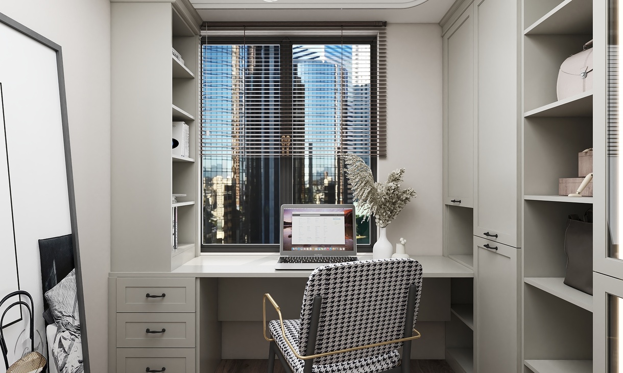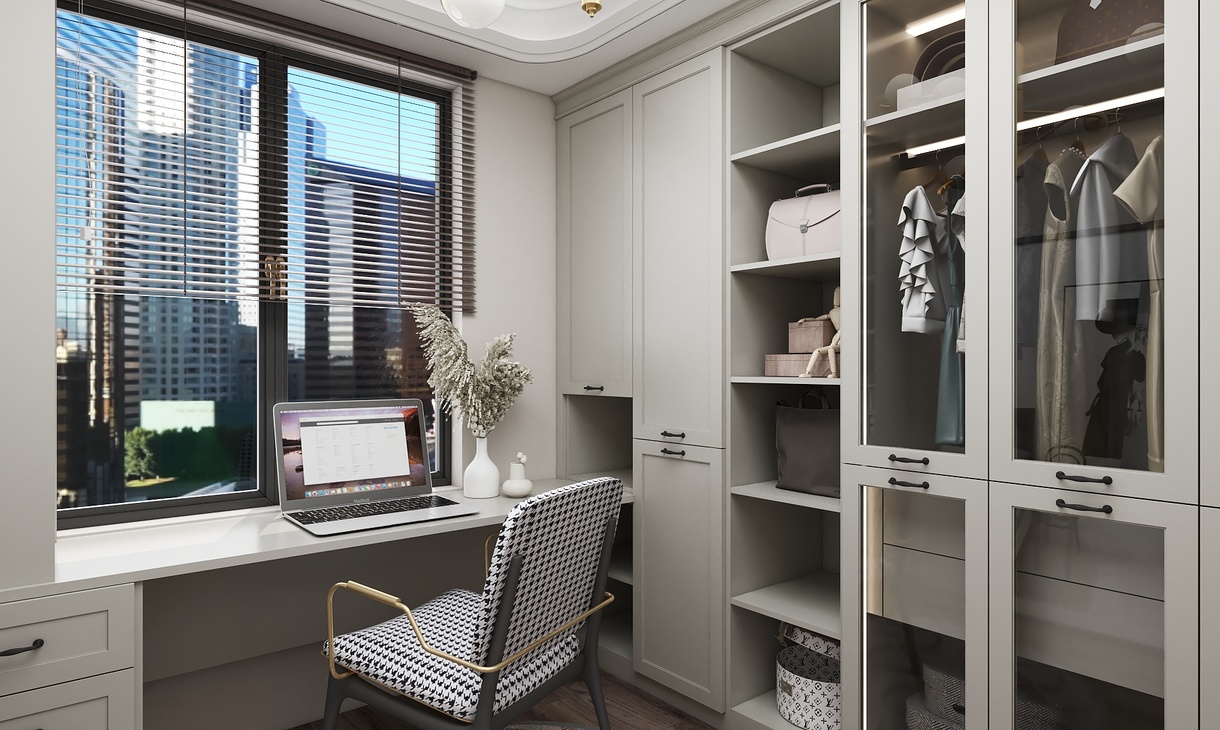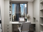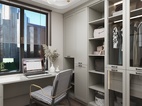 ▲衣帽间的空间不是特别大,在空间的功能需要的时候,可以巧妙的利用空间。书桌兼化妆桌,从衣柜延伸出来。