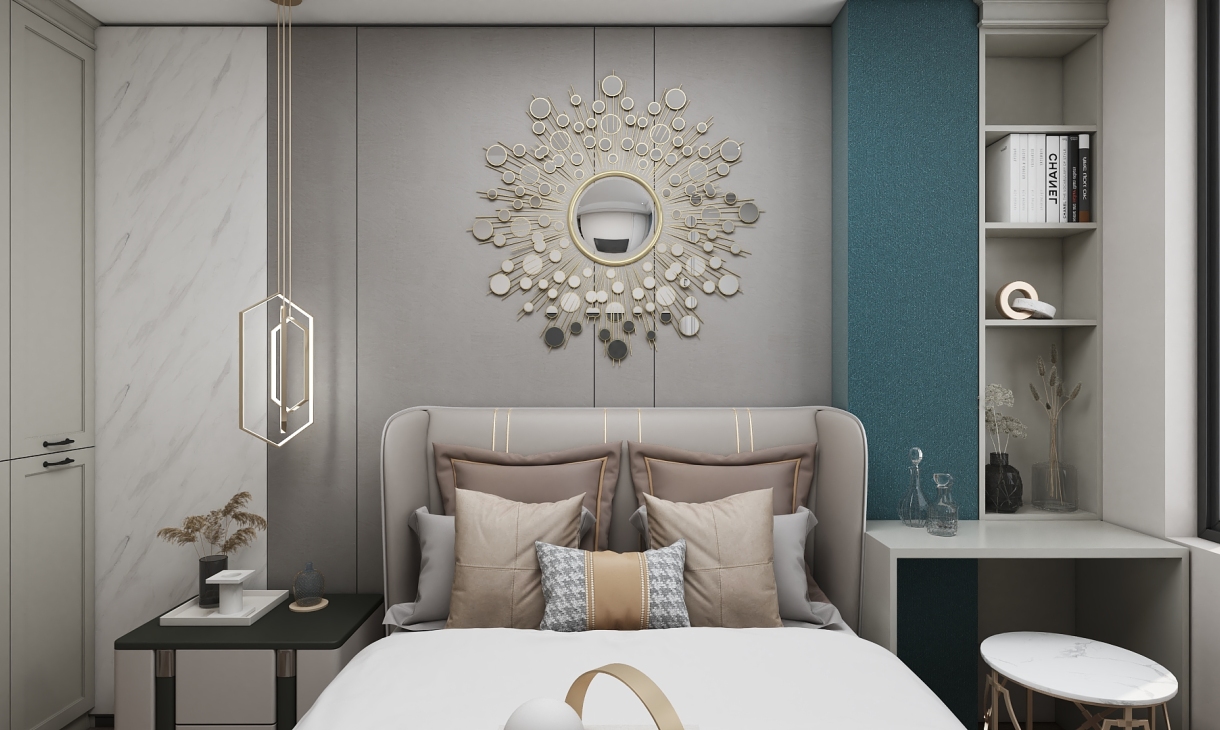 ▲客卧也延续了公区的灰色调,整体依然是浅灰,浅灰搭同色系的家具饰品。不同于卧室主题所带来的色系,墙体做一个调色与衣柜相得益彰。