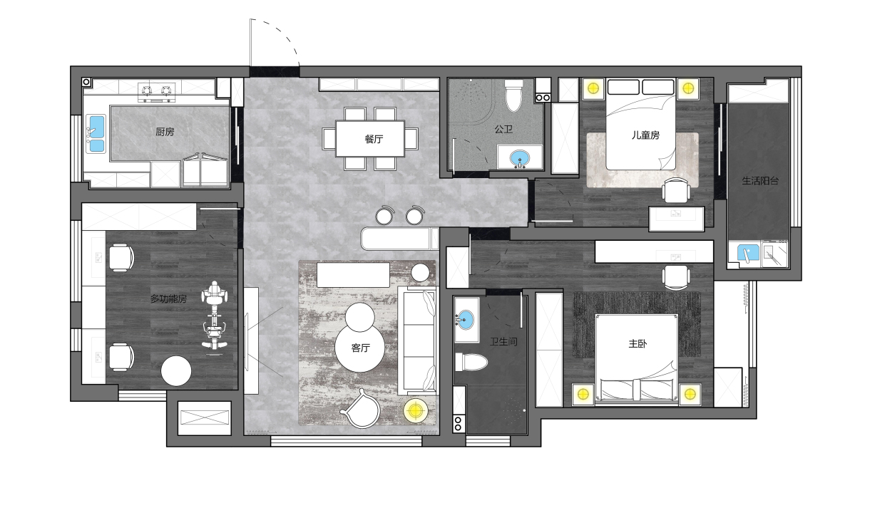 每个空间至少2张效果图+1张全案全景图展示,方案描述完整,所有空间需命名。