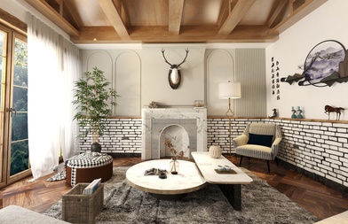 本设计旨在营造一个温馨、舒适的田园风格客厅,带给人们一种回归自然的宁静感。通过大量原木以及自然元素的运用,创造出一个放松身心的空间。