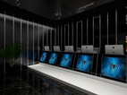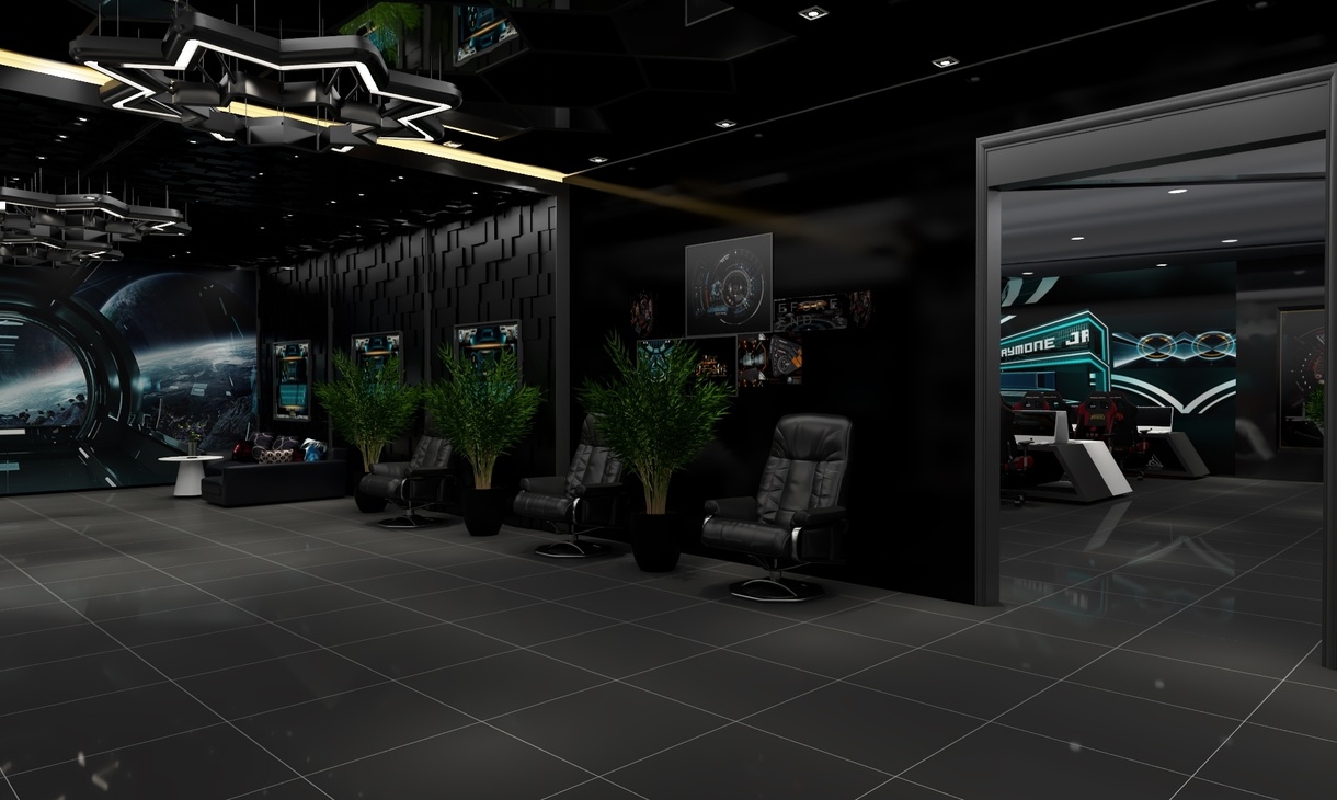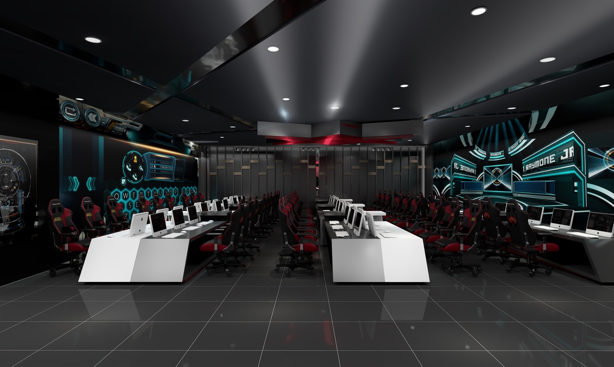 在二楼设备相对密集的竞技区,减少了主题相关的饰物和设计,纯粹用灯光来完成整个空间设计感的延伸,减少密集空间的紧迫感。