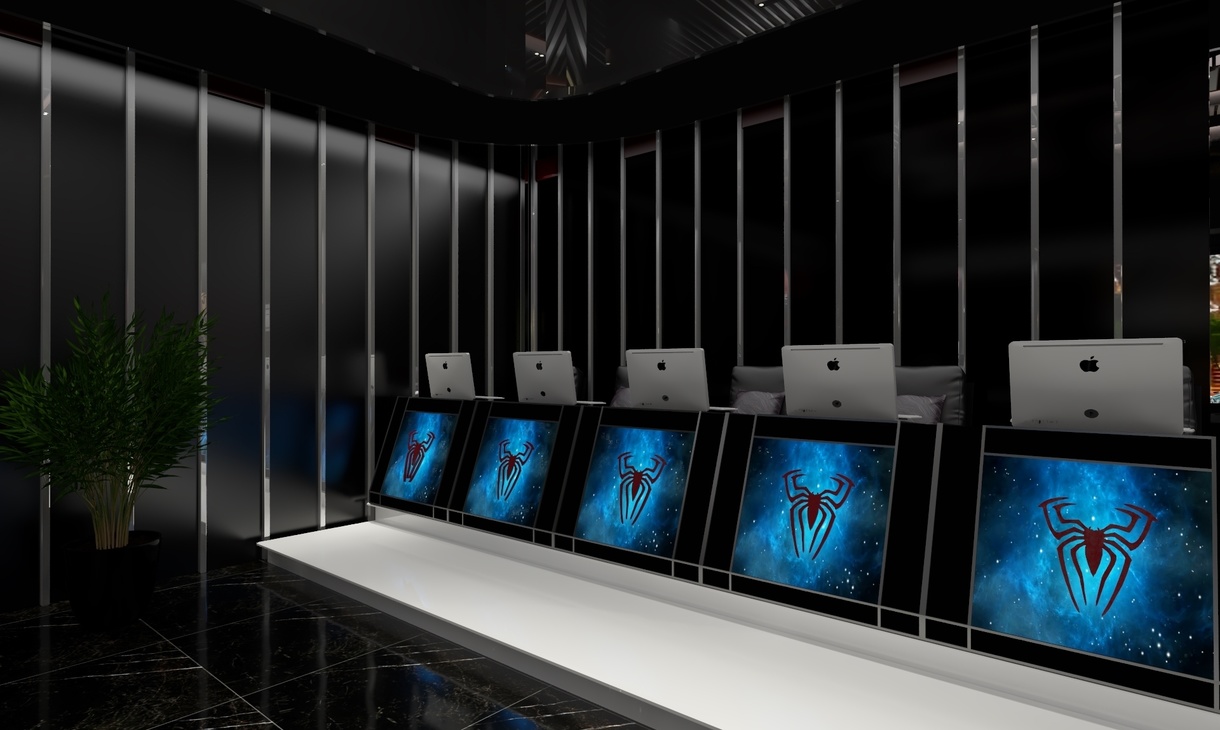 满足电竞游戏里开黑等座位聚集需要,创意性地在空间中加入了圆柱设计,空间里最大亮点是圆柱台有规律交错的线条与“红蜘蛛”背景墙交相呼应,打造了成为了“蜘蛛网”的元素,让整个核心空间与主题完美契合。
