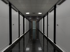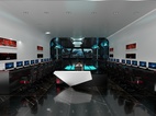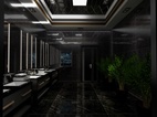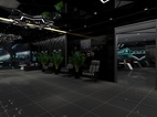 从一楼比赛区的旋梯进入二楼会客区和走道休息区,两个休息区域用不同的辅色来彰显不同空间的性质,相同的是都用线条和具有层次感的吊顶来加强空间感,休息区的绿植也可以适度缓解视觉压力。