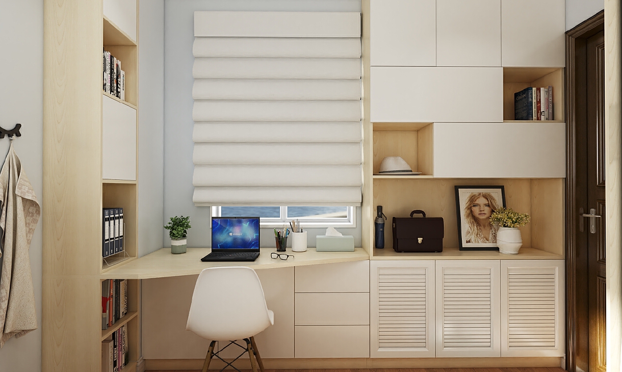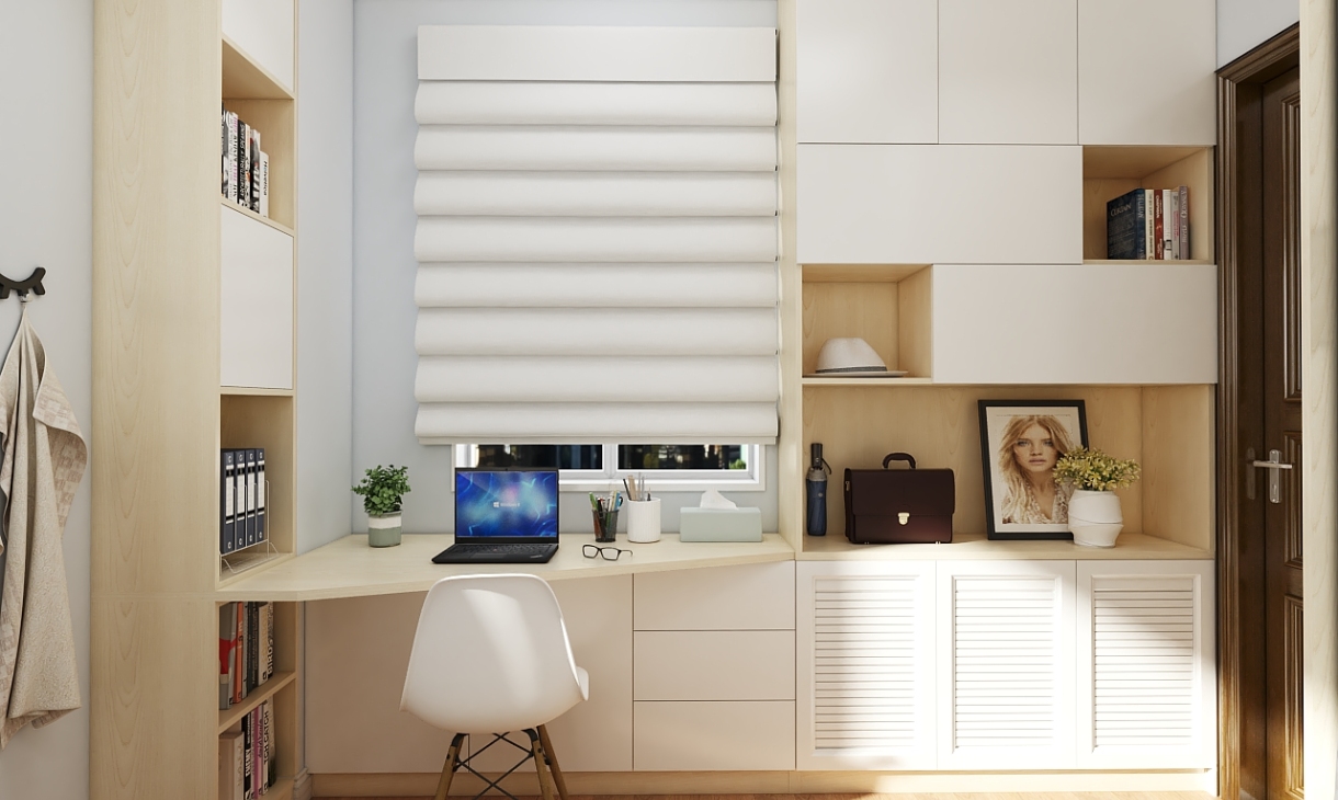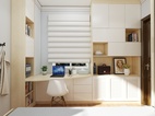 广州白领下班需要在家里办公,要求书桌要大书架要多。10平方的空间带有梁柱,做榻榻米是最好的选择,衣柜床书桌鞋柜一应齐全。