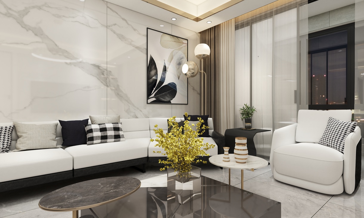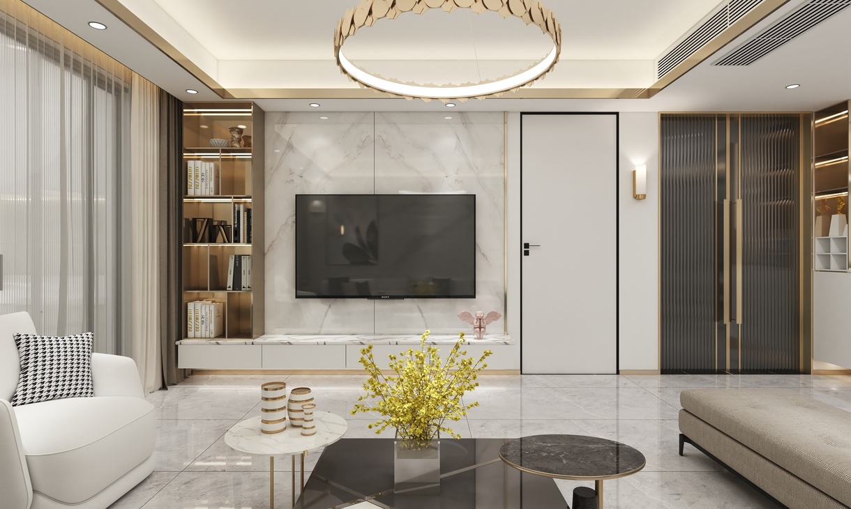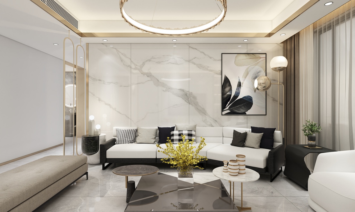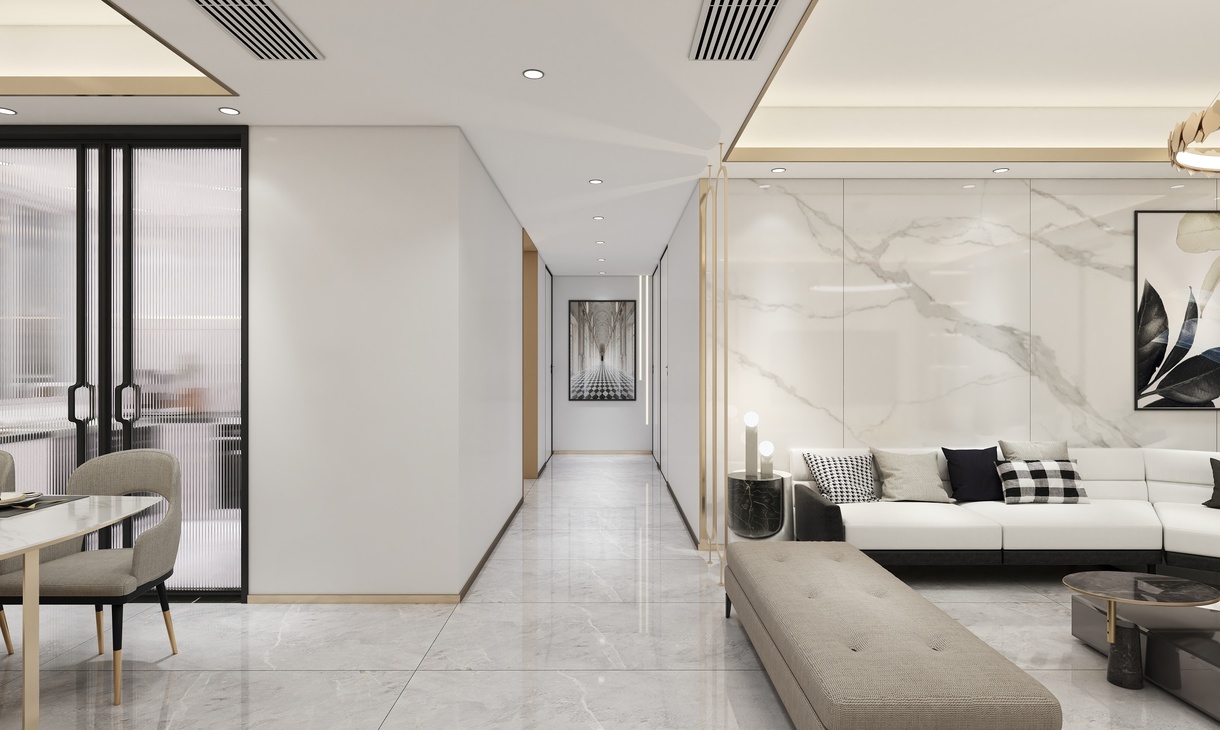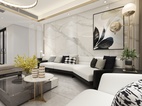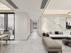 整个方案为轻奢风格,运用室内各种灯光搭配金属元素的质感,以白灰黑为主色调,营造出高级灰的美感。地面瓷砖运用了750*1500灰色大理石瓷砖,以正贴铺贴为主。电视背景墙以对纹1200*2400大板为背景,沙发背景墙以连纹1200*2400大板为背景,整体看起来简单大方,却不失大理石纹理的高端大气,因为大板的缘故,缝少了,表面看起来就是大理石一样的感觉,却比大理石更加的耐脏易打理。大板背景墙已成为现下最为流行的瓷砖背景墙之一。