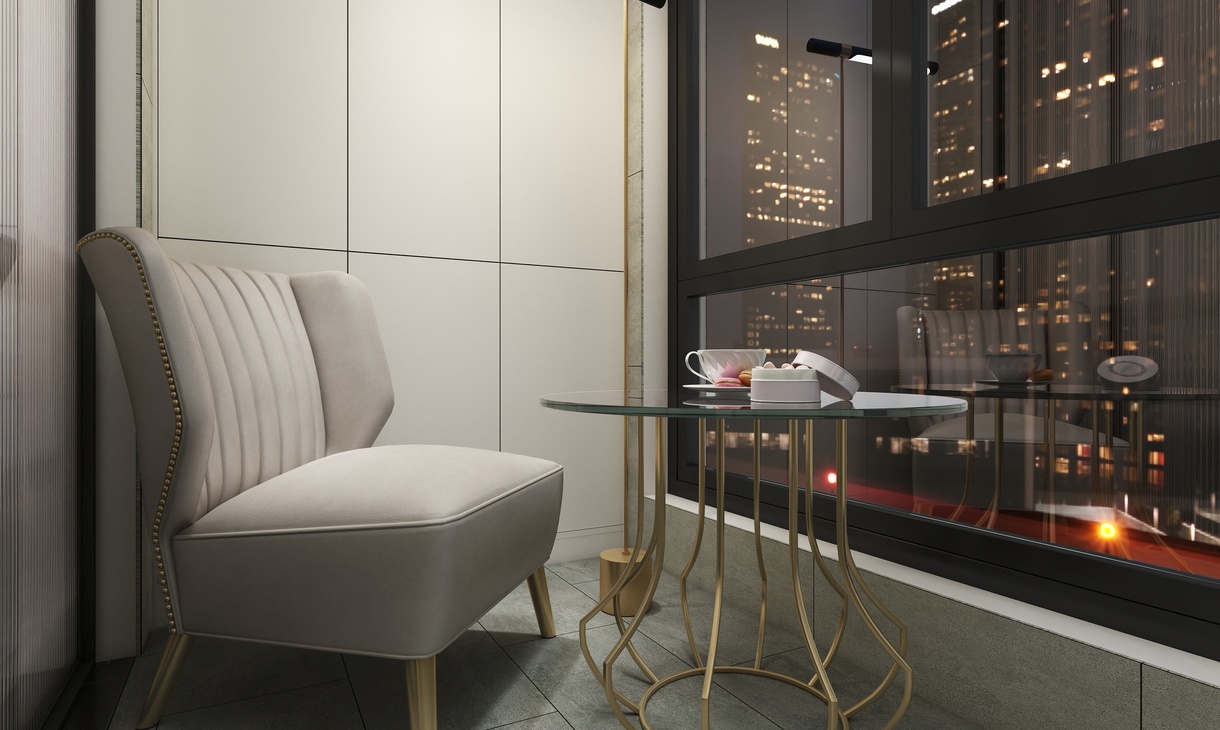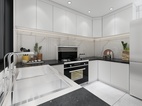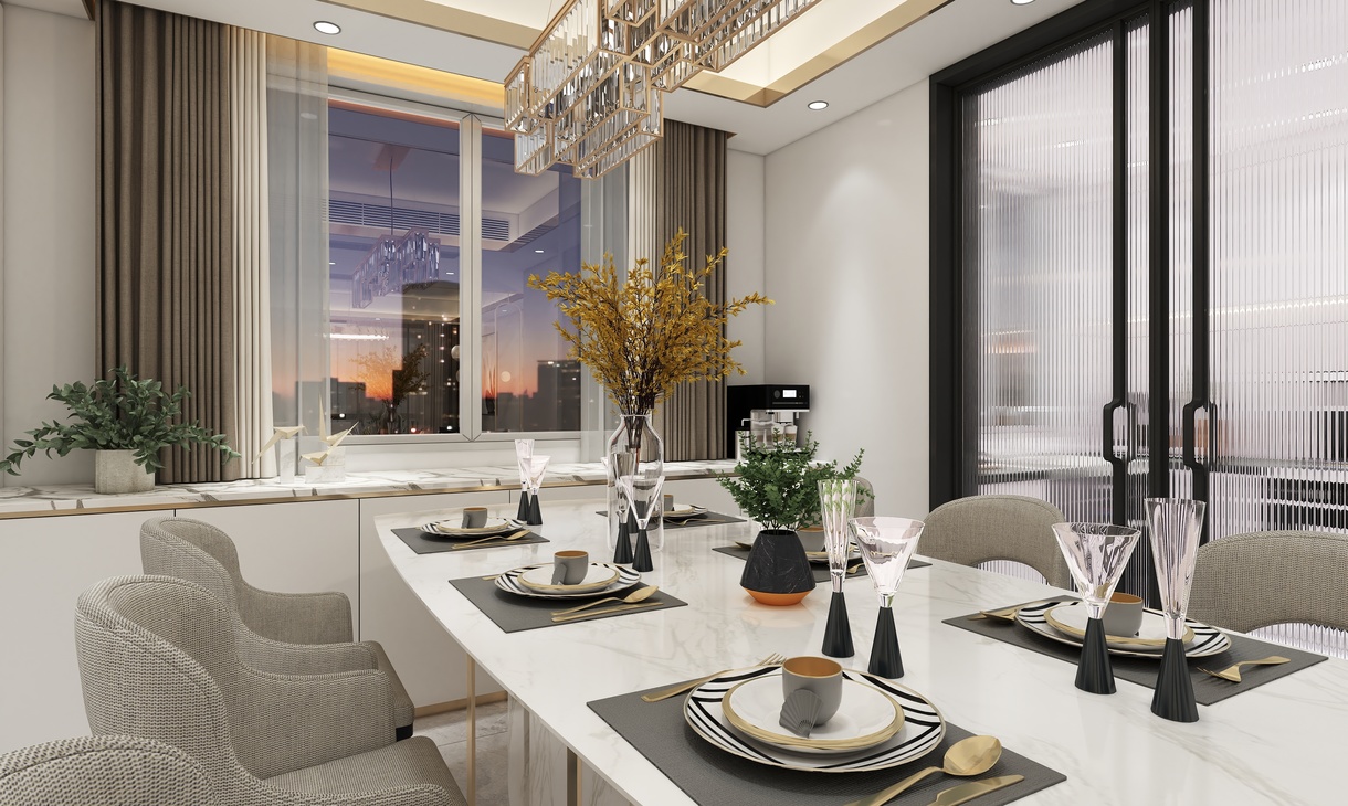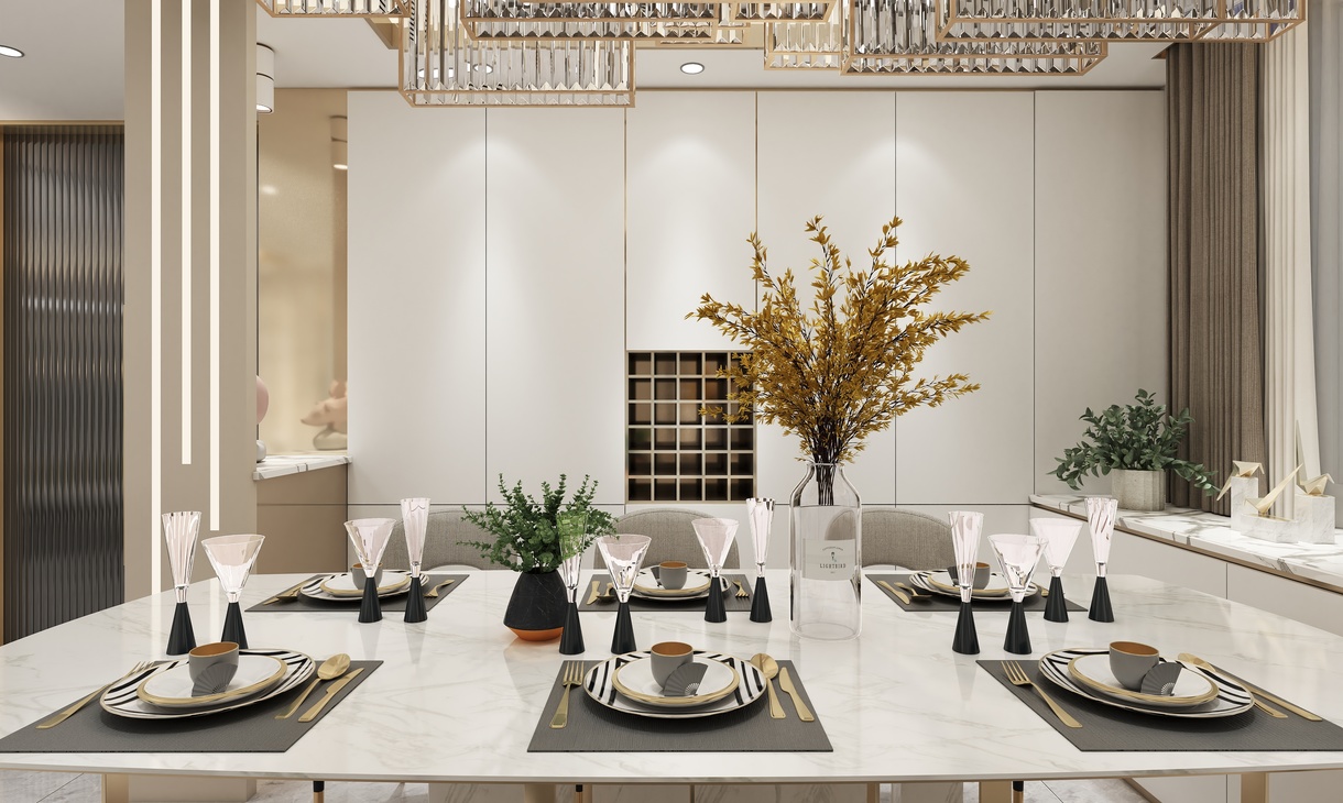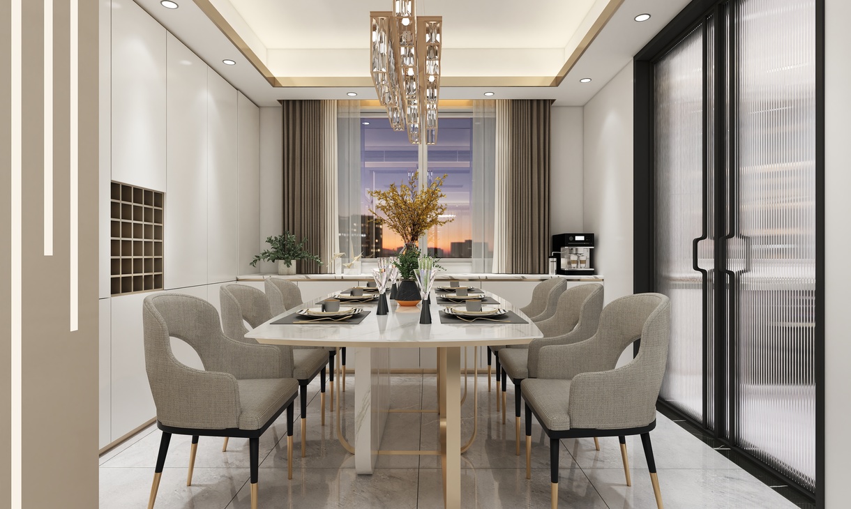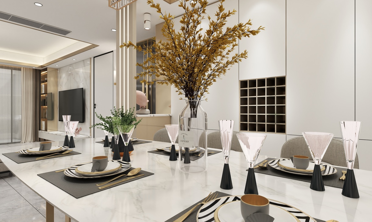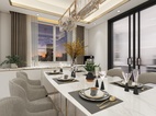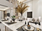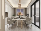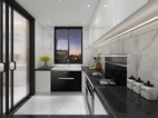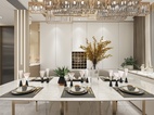 客餐厅区域的柜体以钛金不锈钢为主,门板以简单的白色搭配。典雅中带有一丝尊贵气息。不管是白色的门板还是餐桌白色大理石台面,都于地面灰色瓷砖相相呼应搭配。整体看上去自然协调。钛金不锈钢材质的酒架也让简单中带入一些特色。