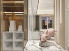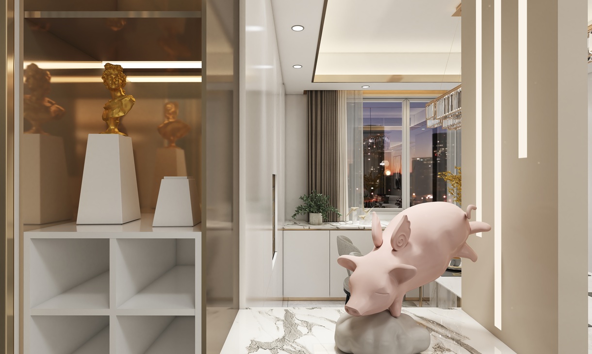 玄关柜于酒柜连在一起,能大大利用空间上的优势,同时镂空的设计,让视觉也能更好的穿透过去,增加自然光的照射。墙面内嵌灯带的设计,让整体方案主题得以体现,流逝的光线,就和光阴一样。充满了现代感。