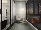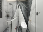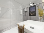 湿区的设计以时尚感为主,深色地面大板瓷砖,于墙面个性大板瓷砖的设计,让深色的视觉从上汇聚于下,在从下延伸到整个空间的感觉,充满了未知的可能。